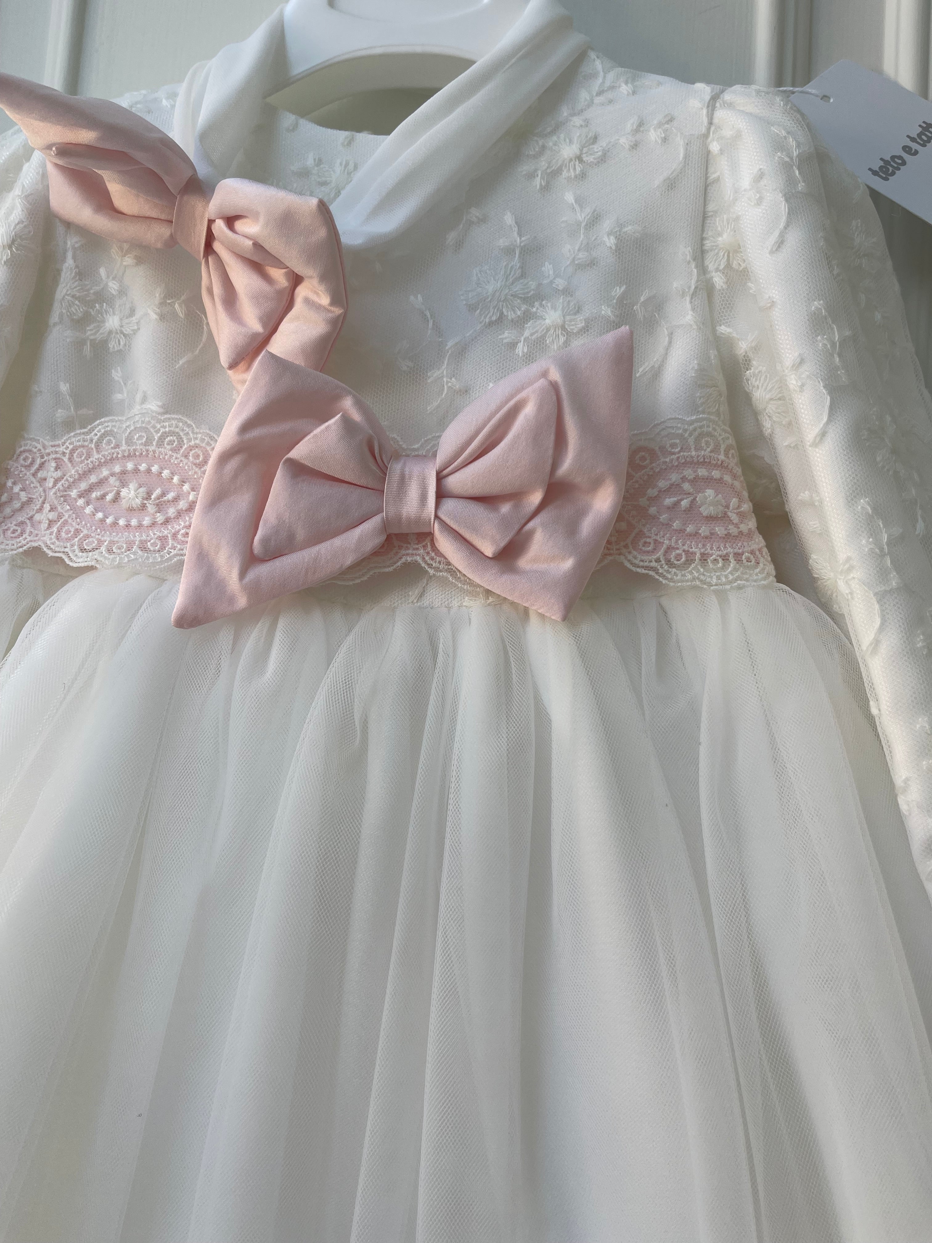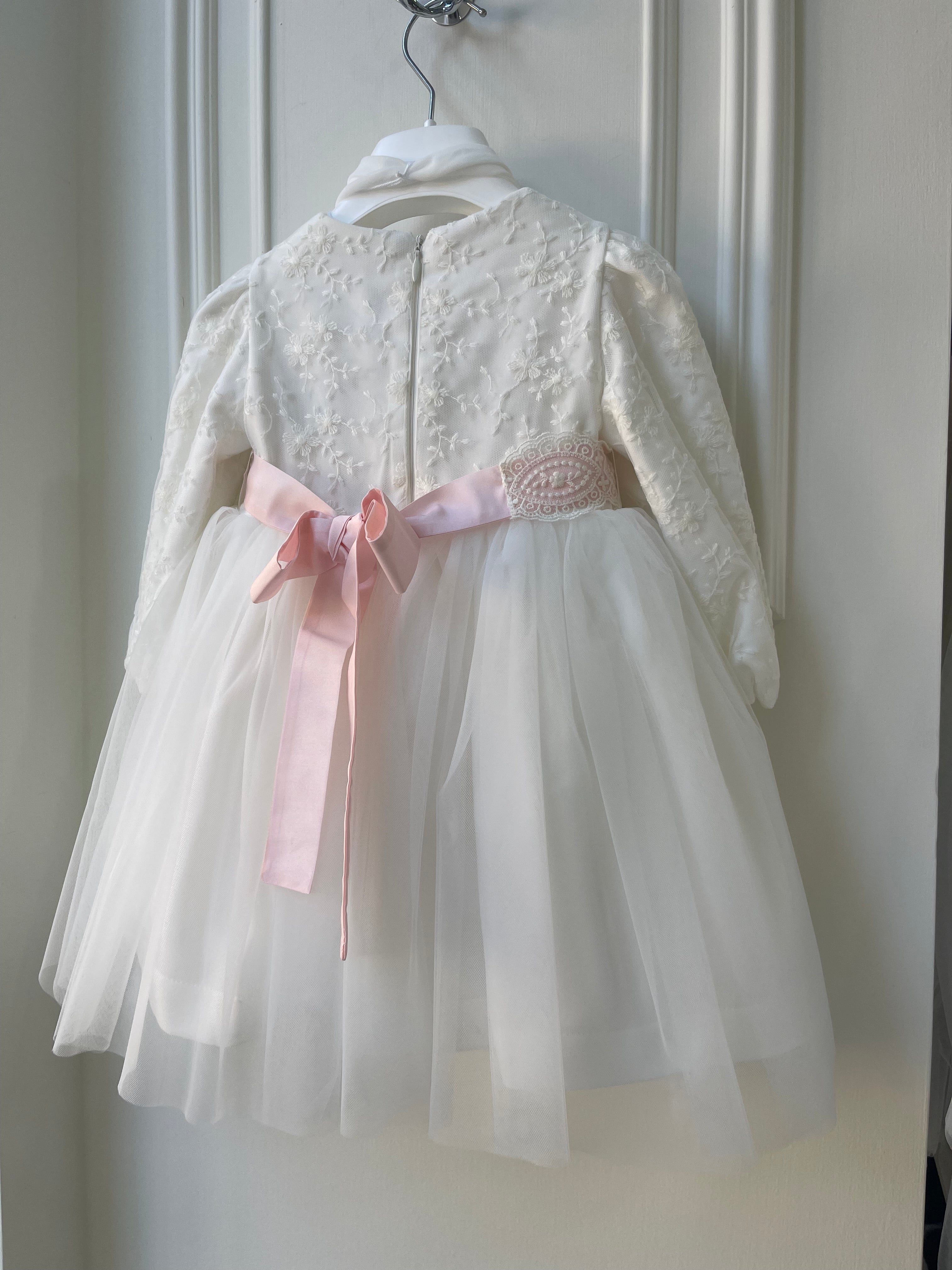Abito Battesimo Bimba con corpetto in pizzo a manica lunga rivestito in caldo cotone , gonnellone in tulle sotto rivestito... Per saperne di più