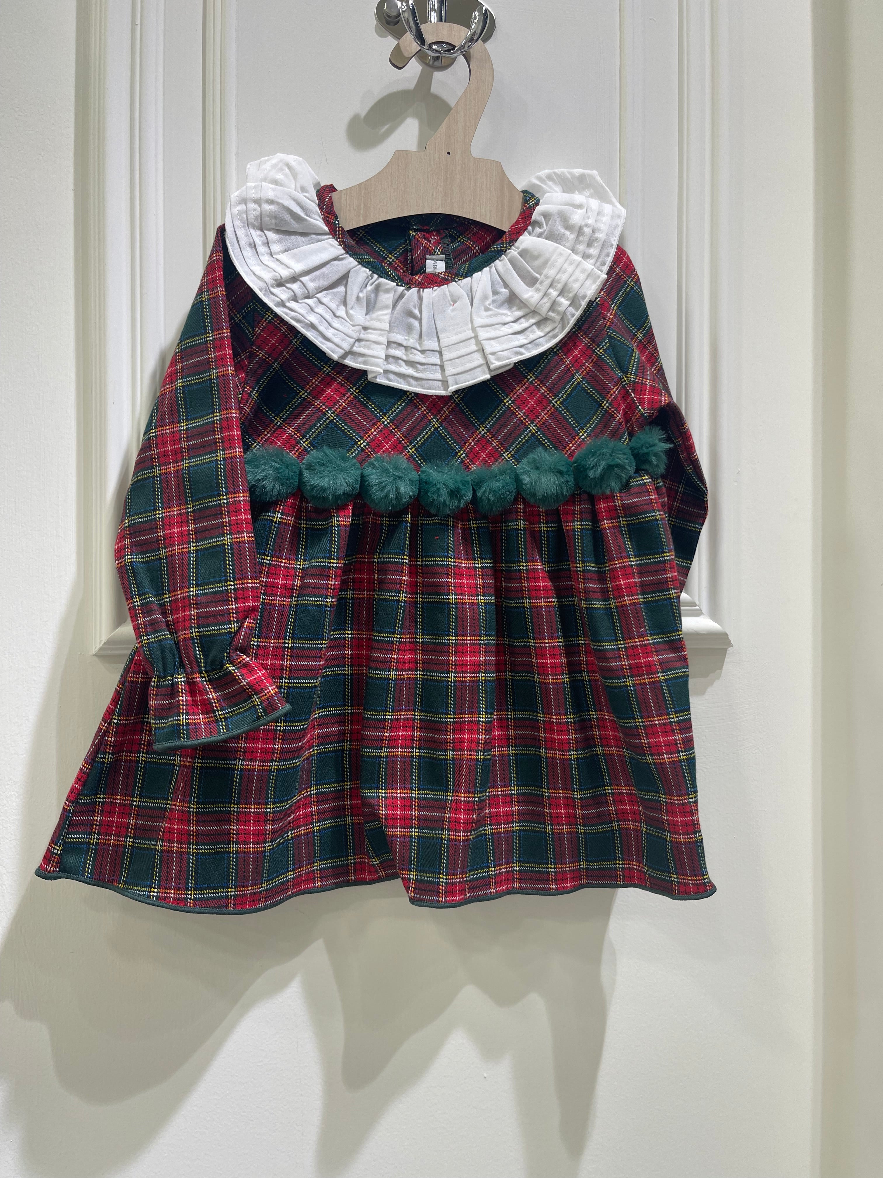 Abito a quadri scozzese con collo rouche bianco e pon pon verde bottoni sul vetro , vestibilità regolare Per saperne di più