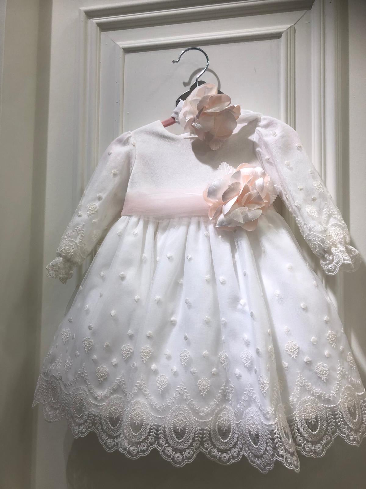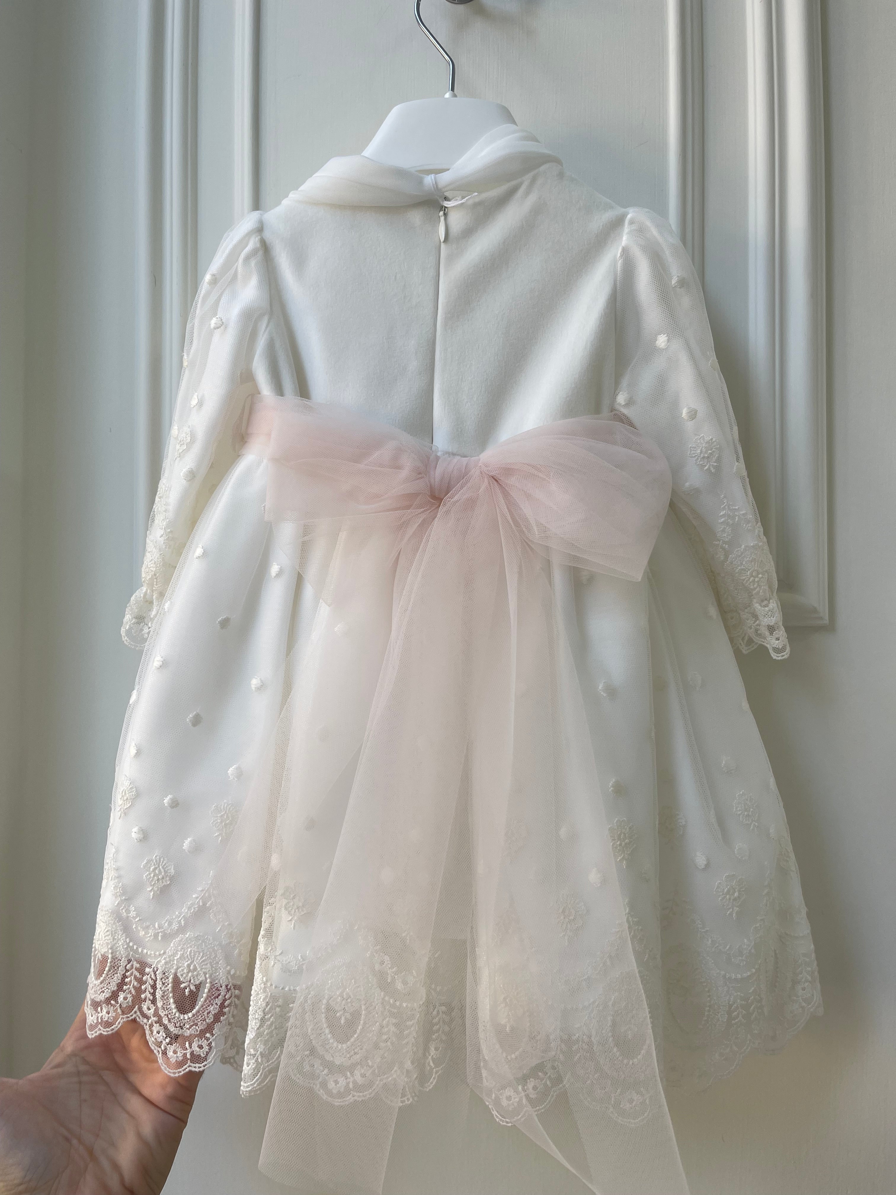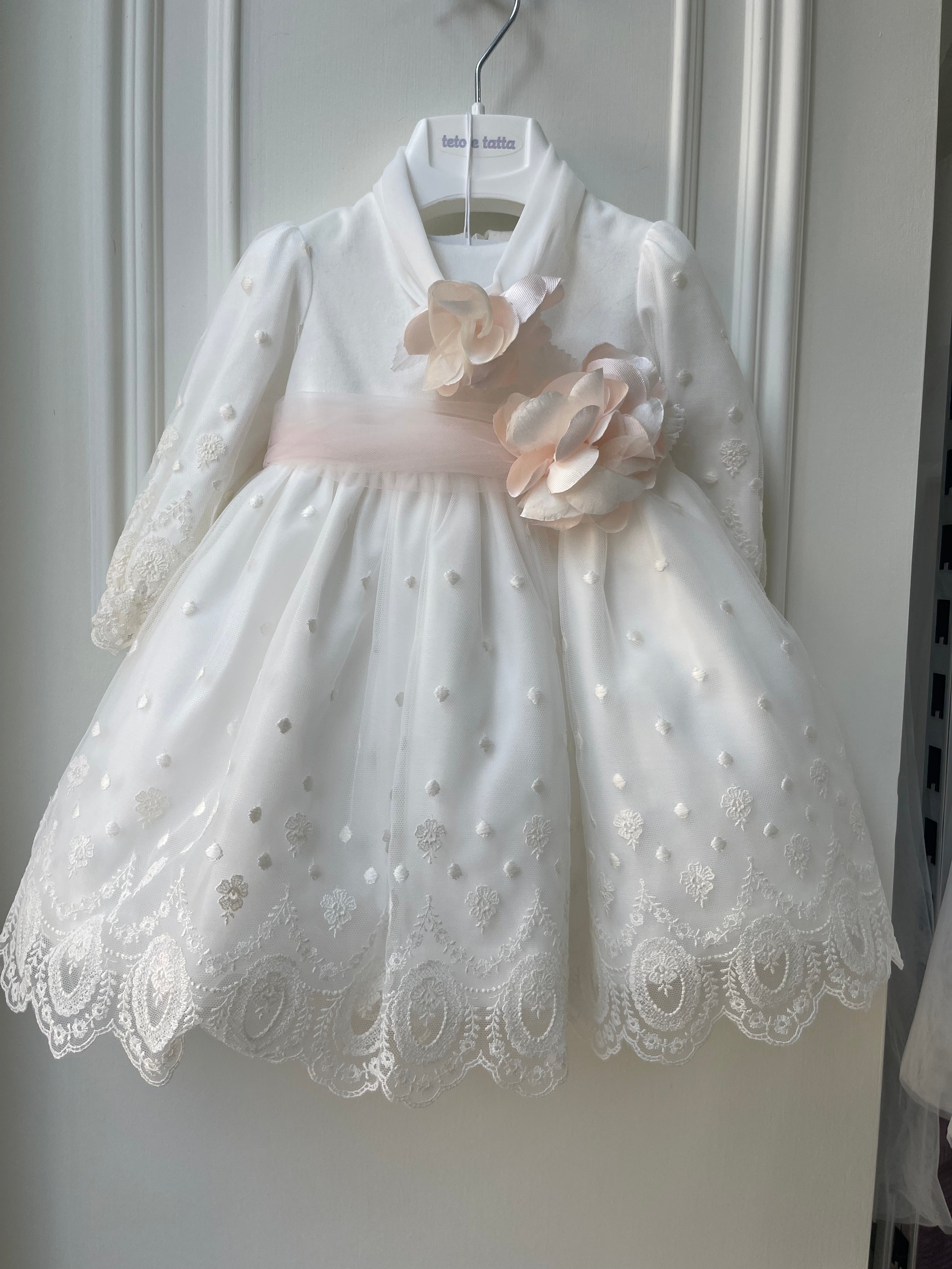 Meraviglioso abito a maniche lunghe con corpetto lavorato con pizzo e gonnellone lavorato con tulle e pizzo , fascia in... Per saperne di più