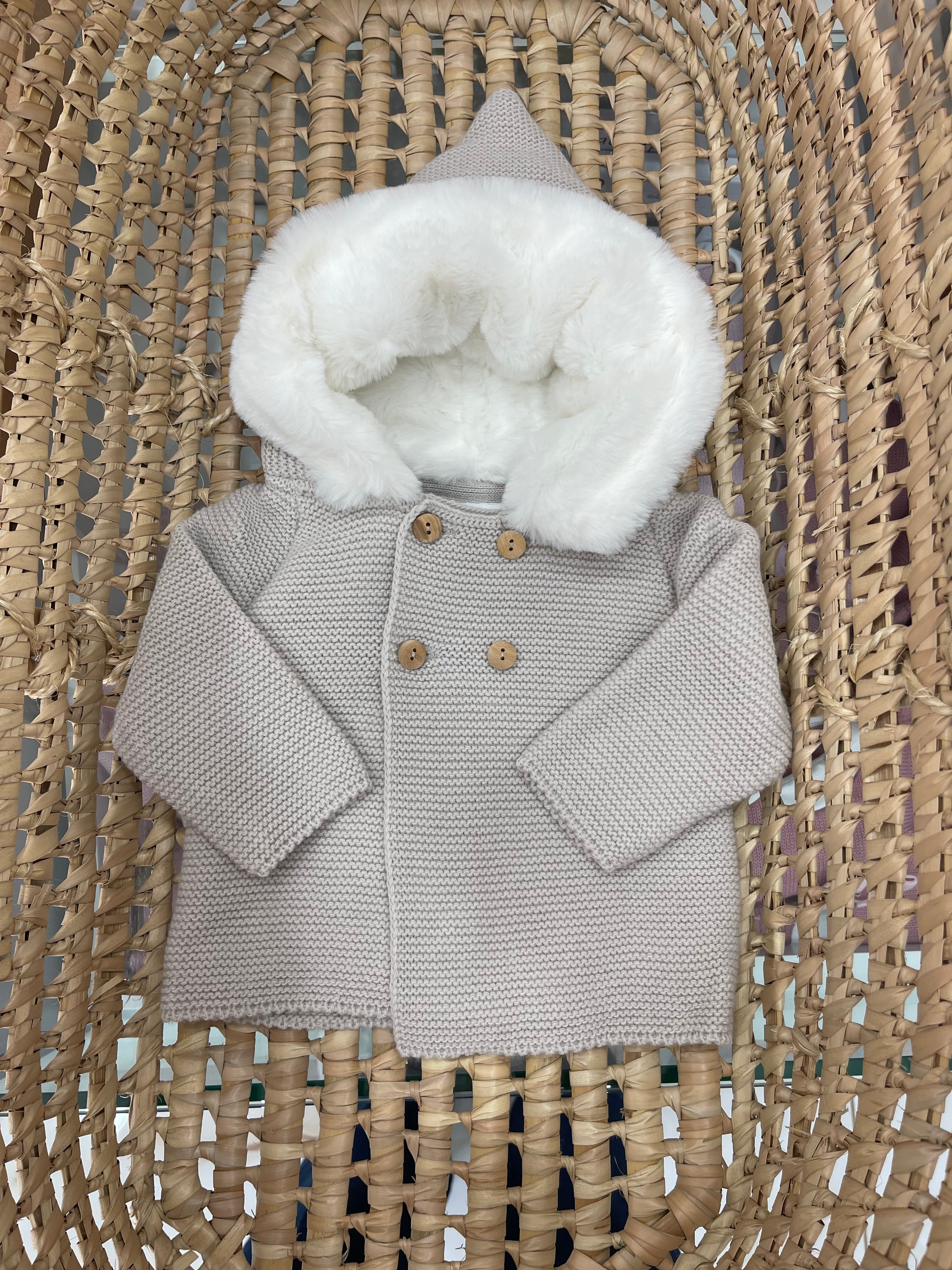 Capottino in maglia unisex con bottoni e pelliccia in cappuccio