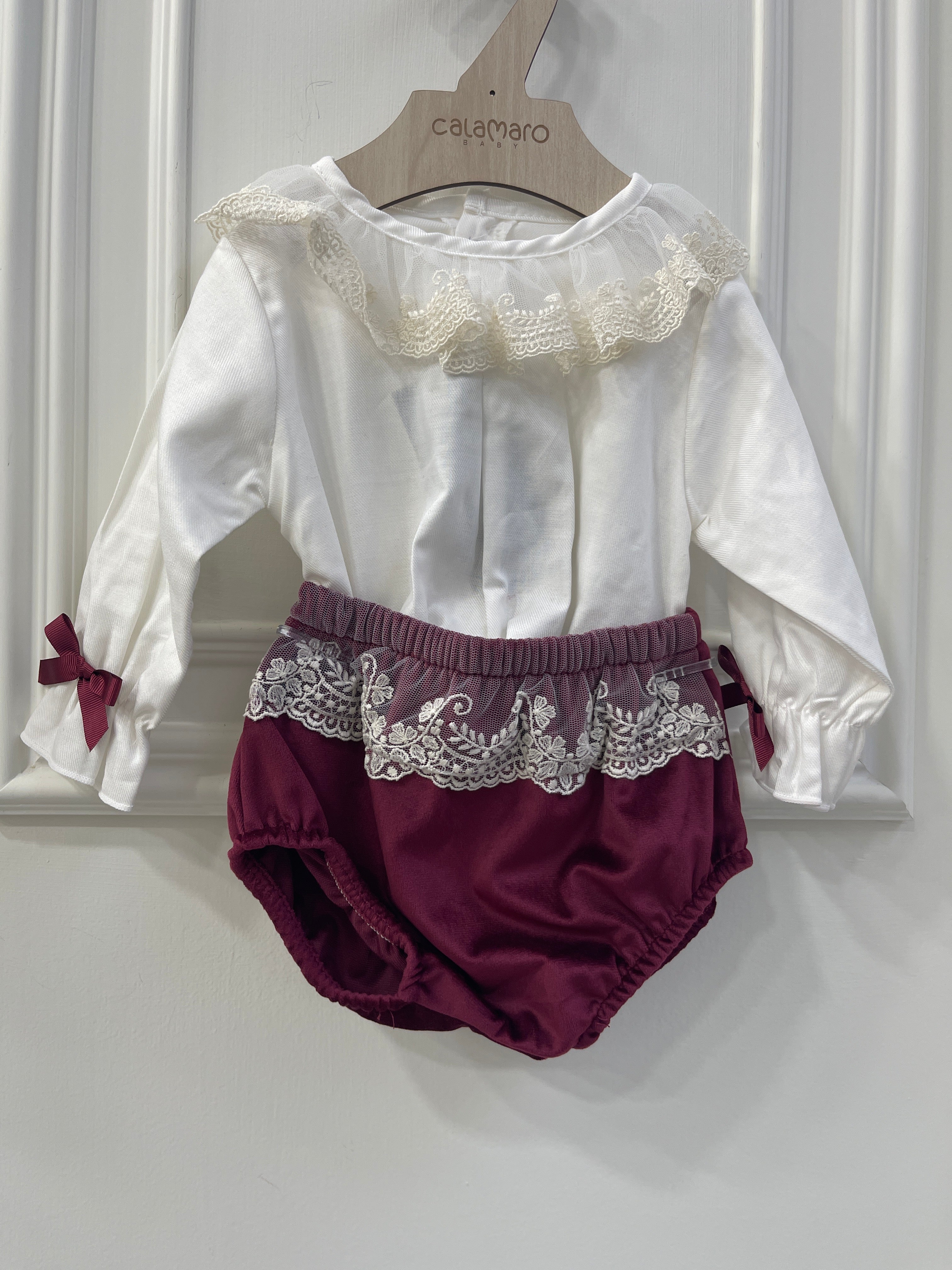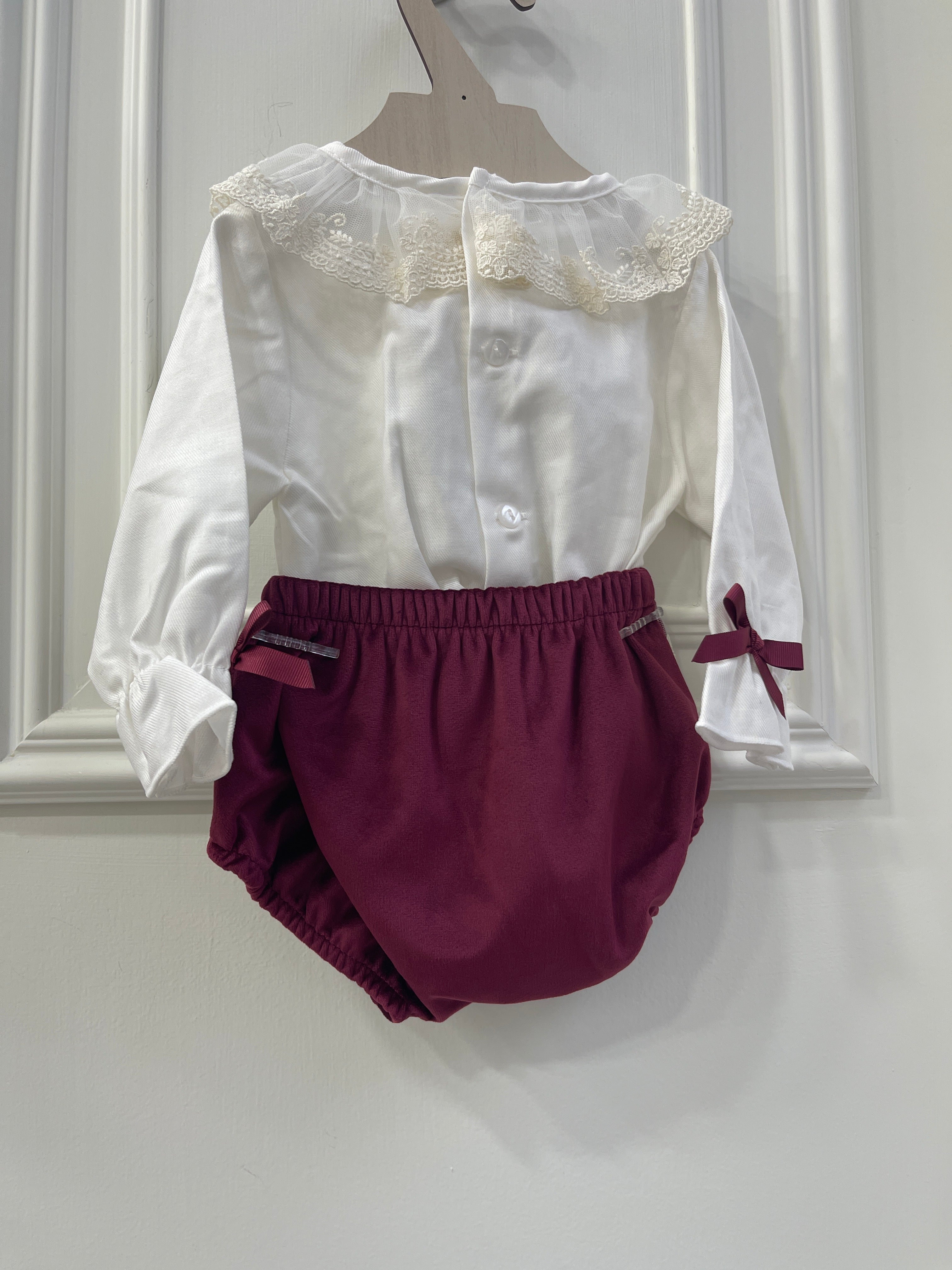 Completo con culotte di velluto bordeaux e rouche , Camciia con collo di pizzo e volant vestibilità piccola Per saperne di più