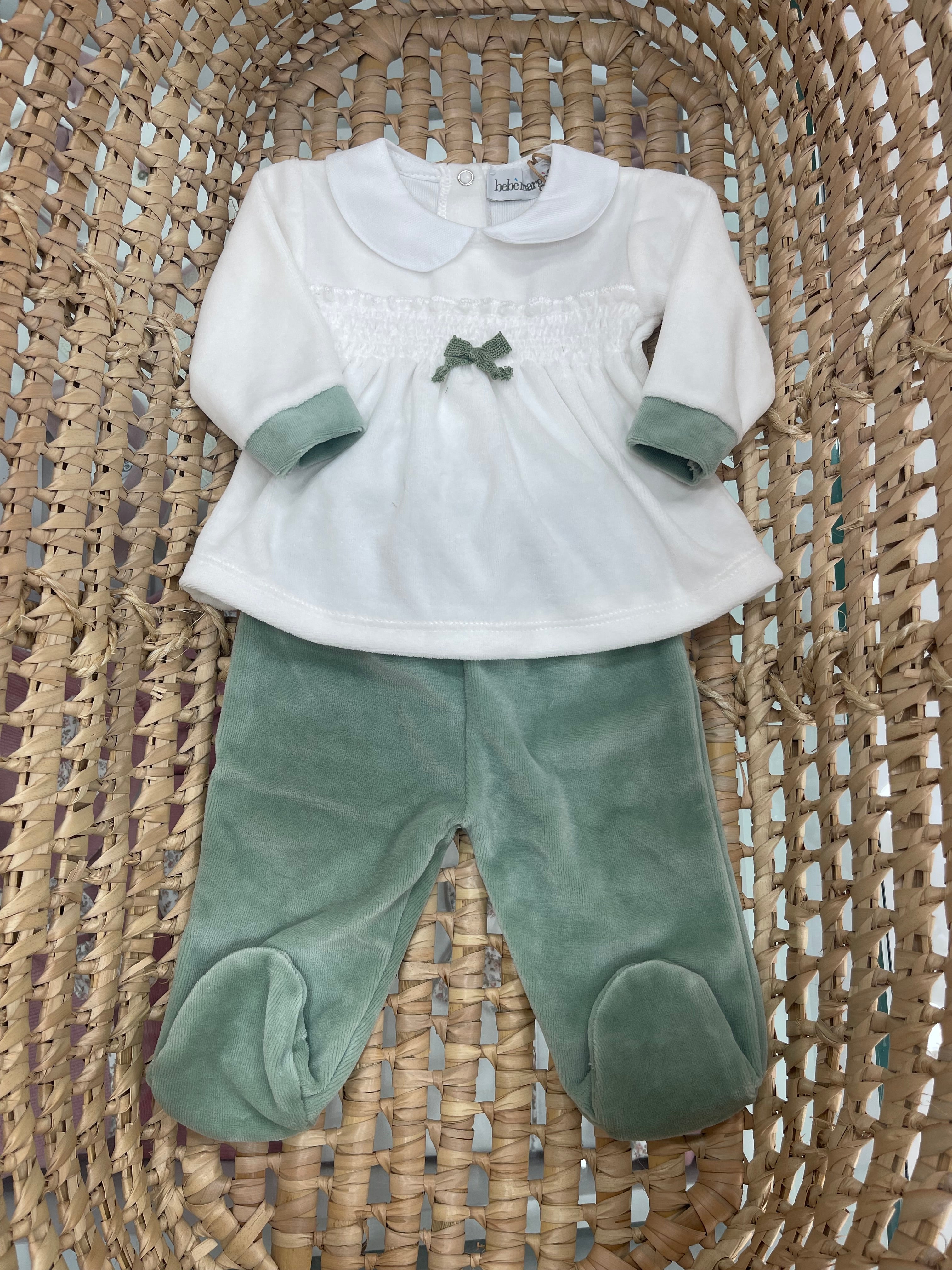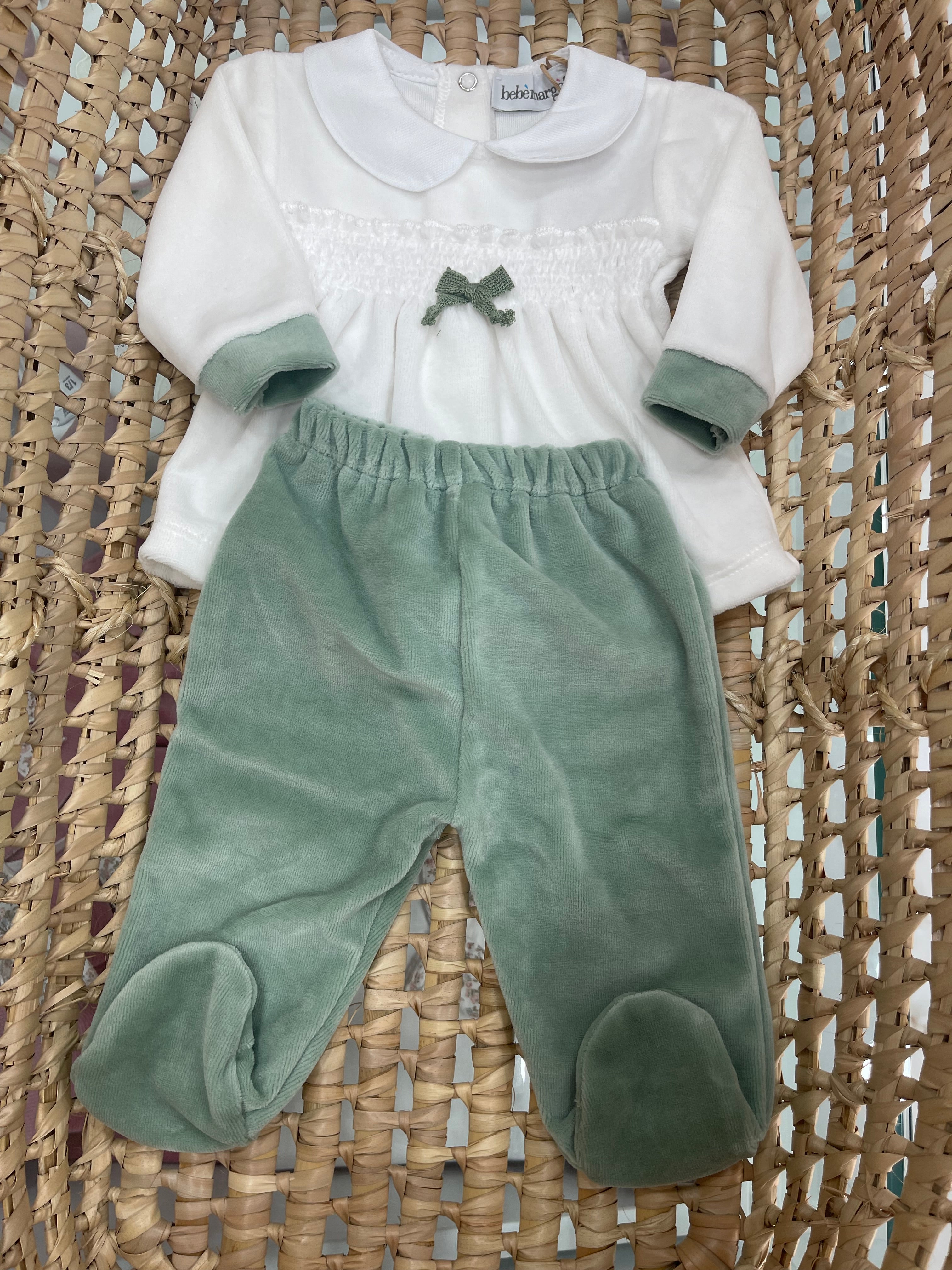 Completo in ciniglia Bianco e verde salvia , con fiocco sul davanti e colletto , ghettina con elastico e piedini ... Per saperne di più