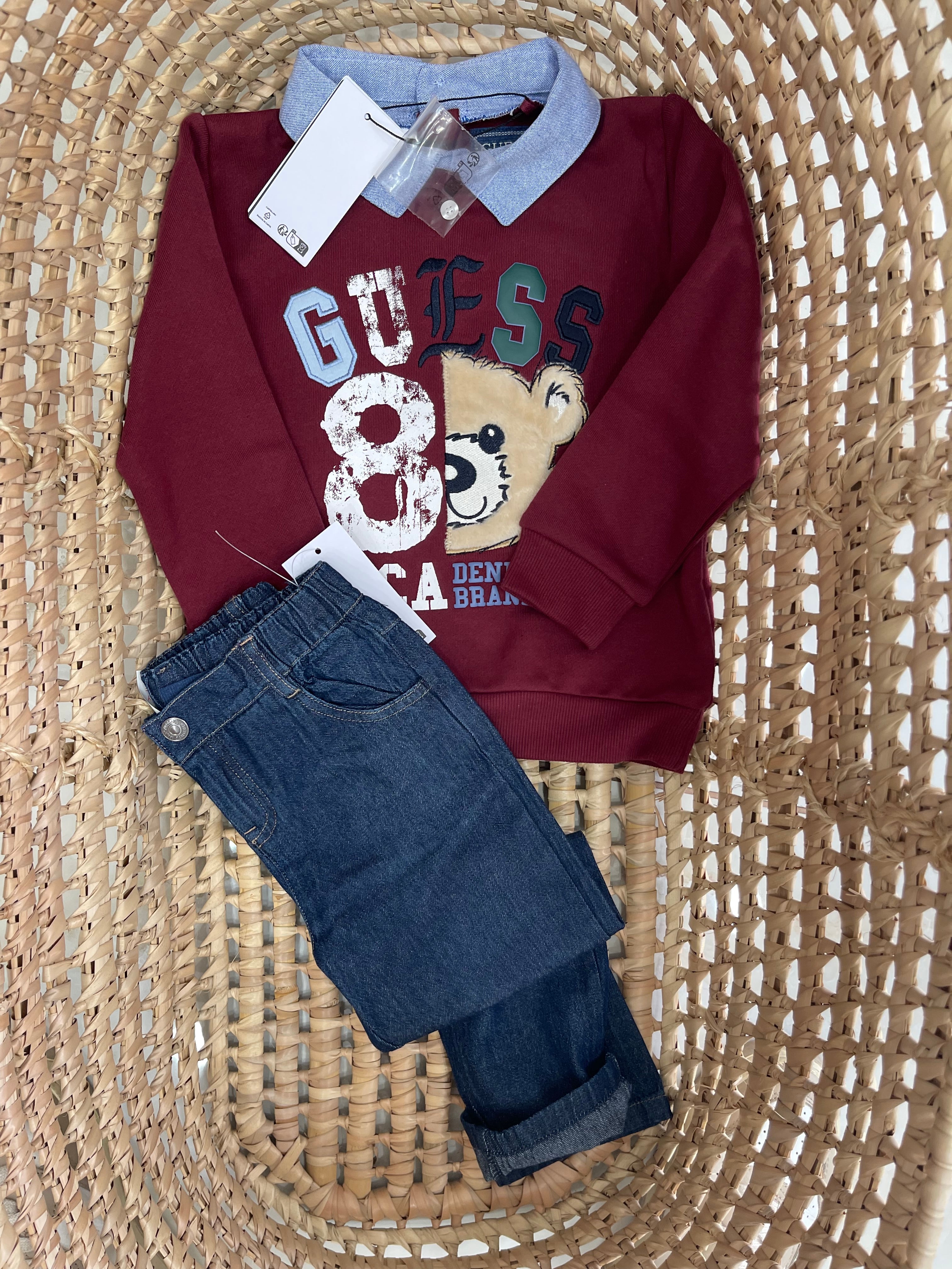 Completo con Felpa con collo camicia finta , jeans morbido con elastico in vita vestibilita comoda Per saperne di più