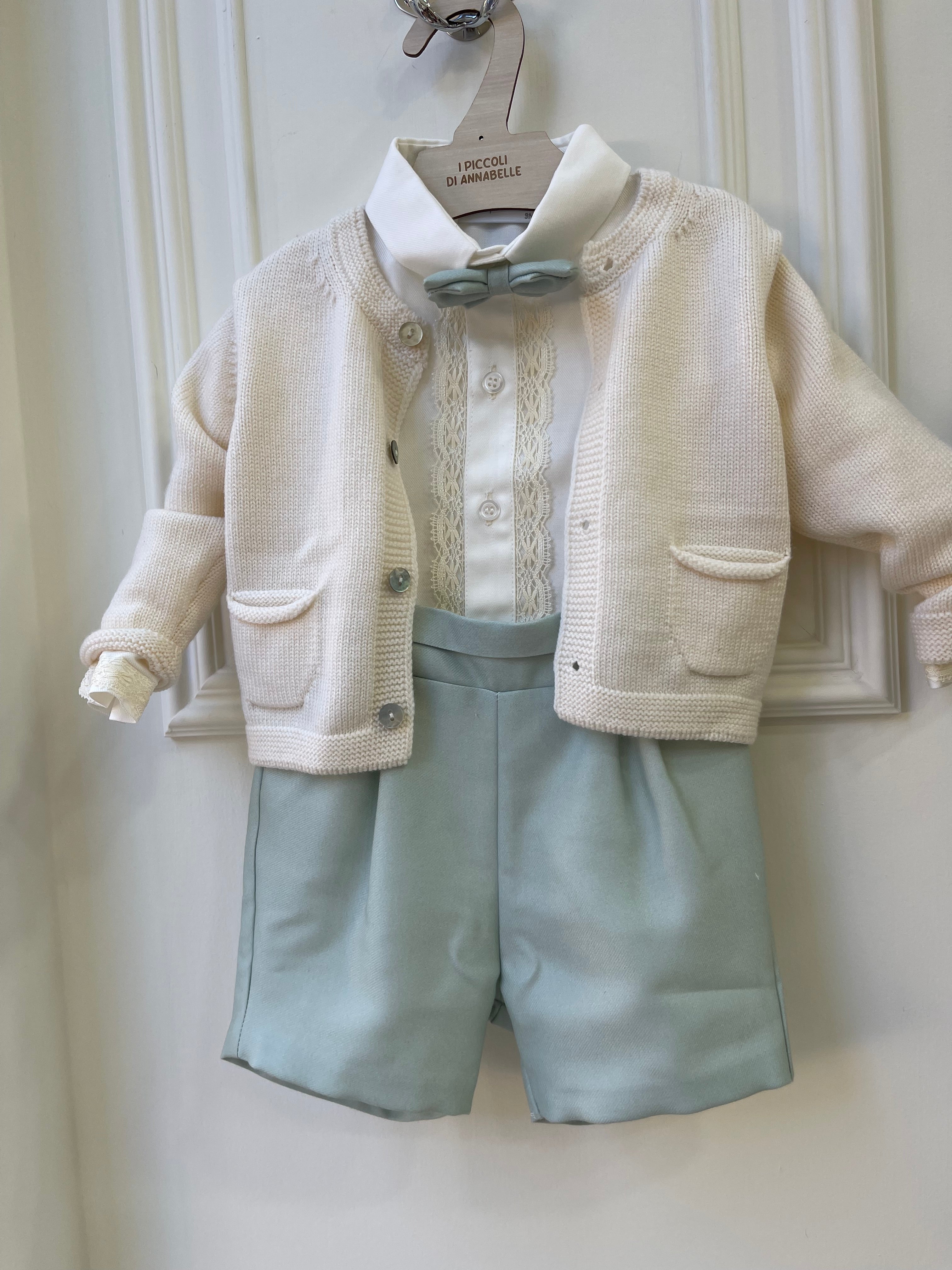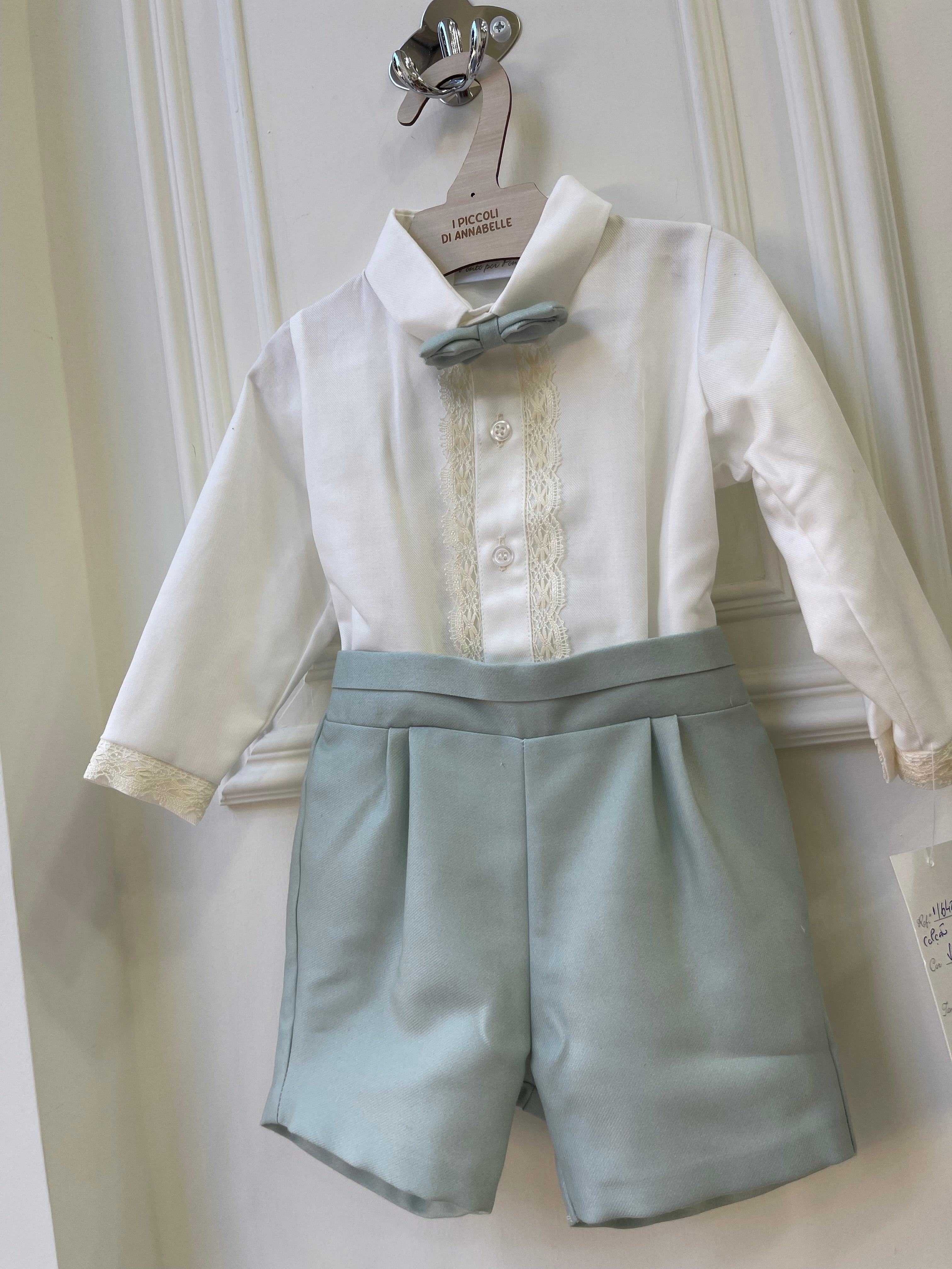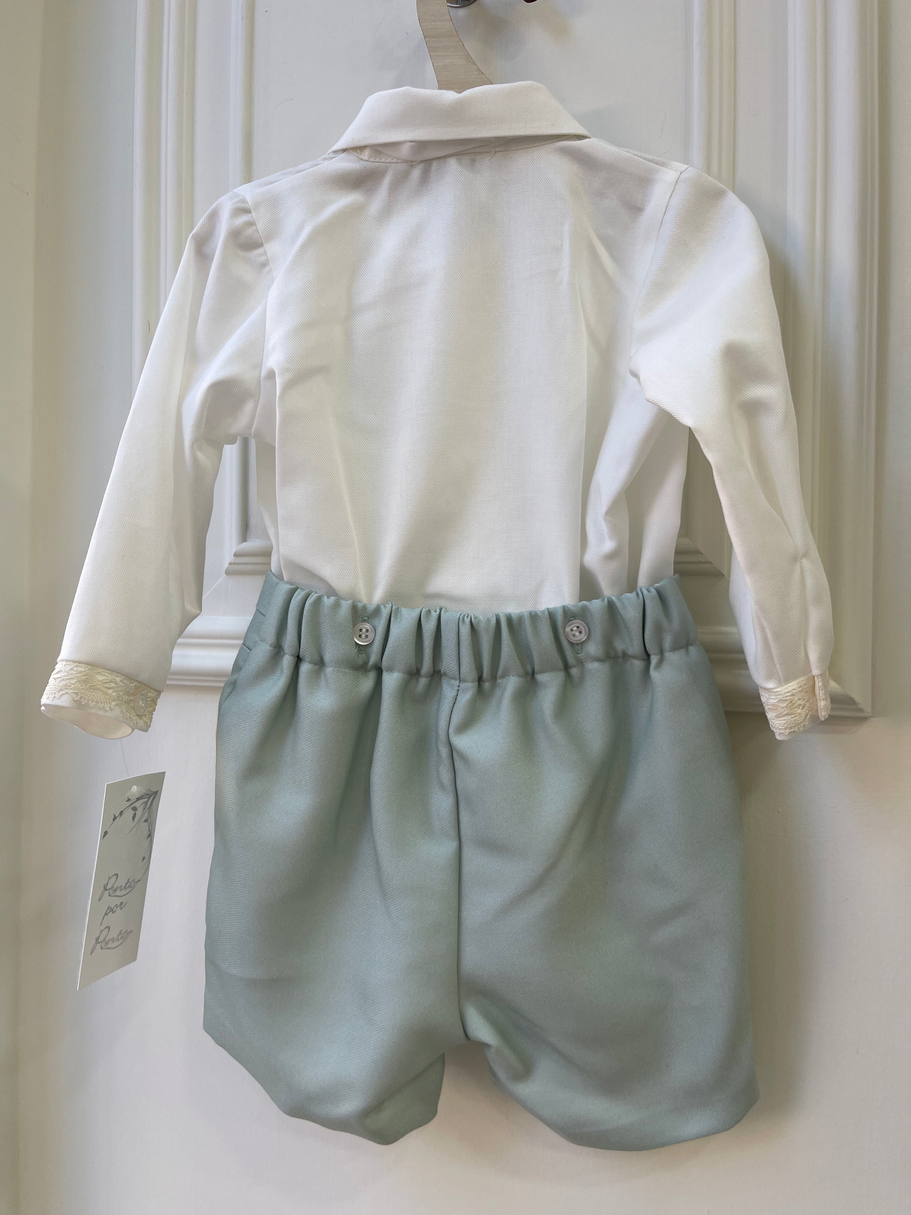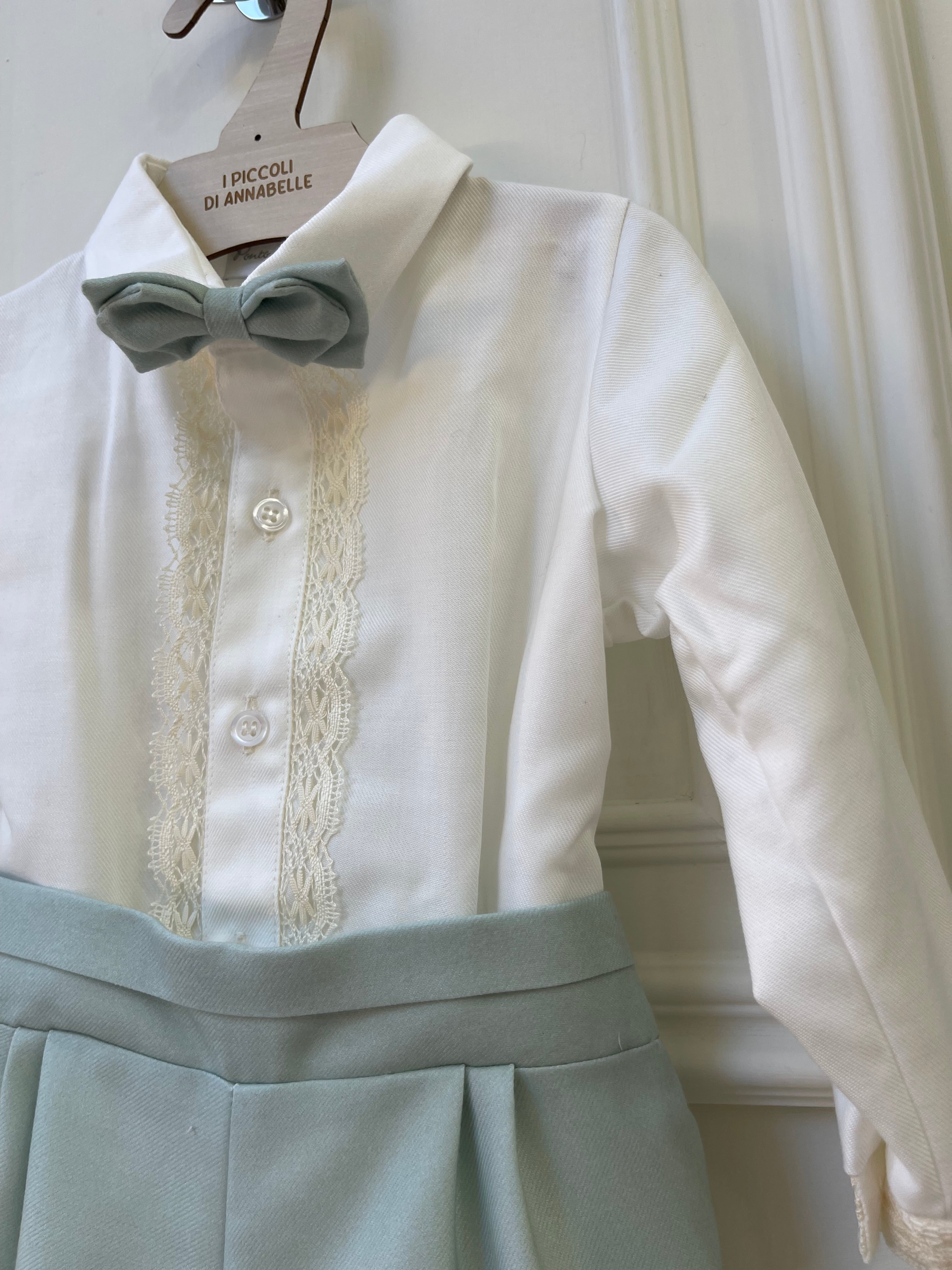 Completo elegante in verde salvia , camicia operata collo coreana con papillon , pizzo rebrode , pantaloncino in verde salvia... Per saperne di più