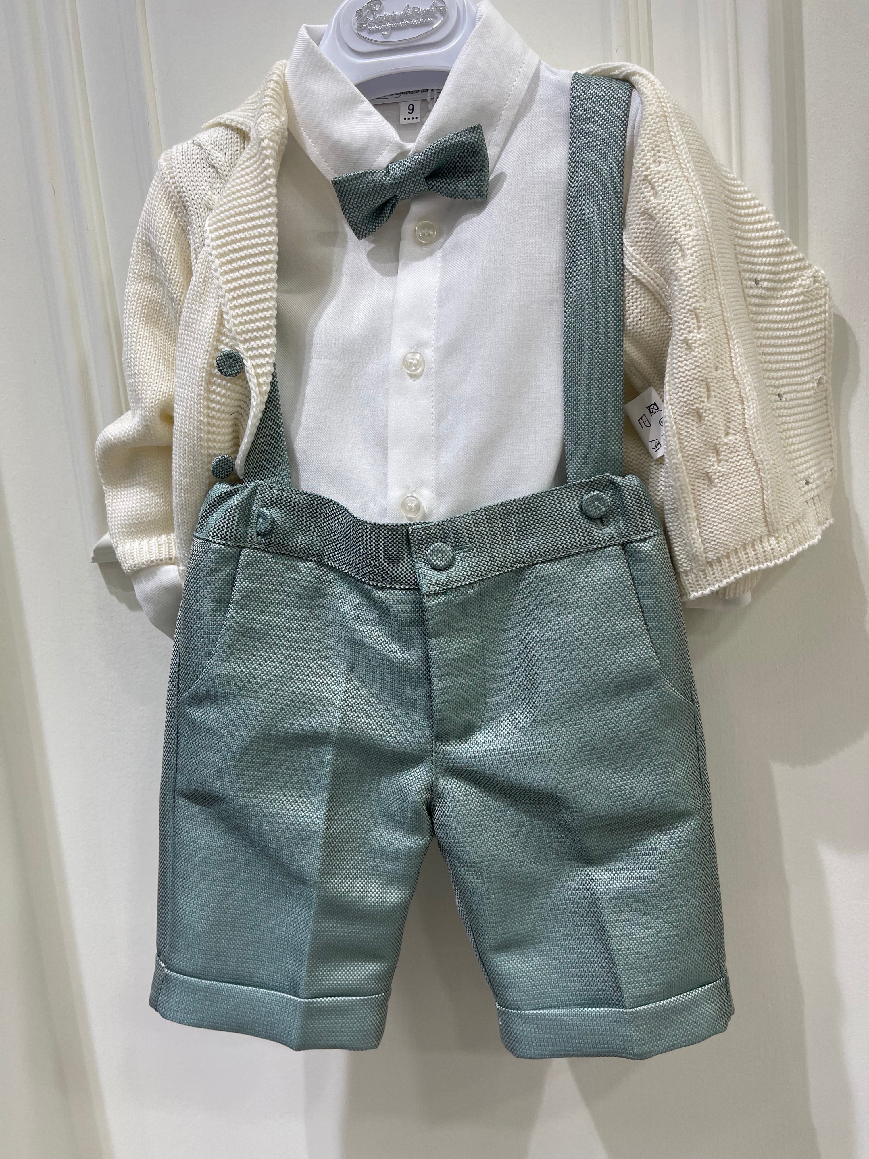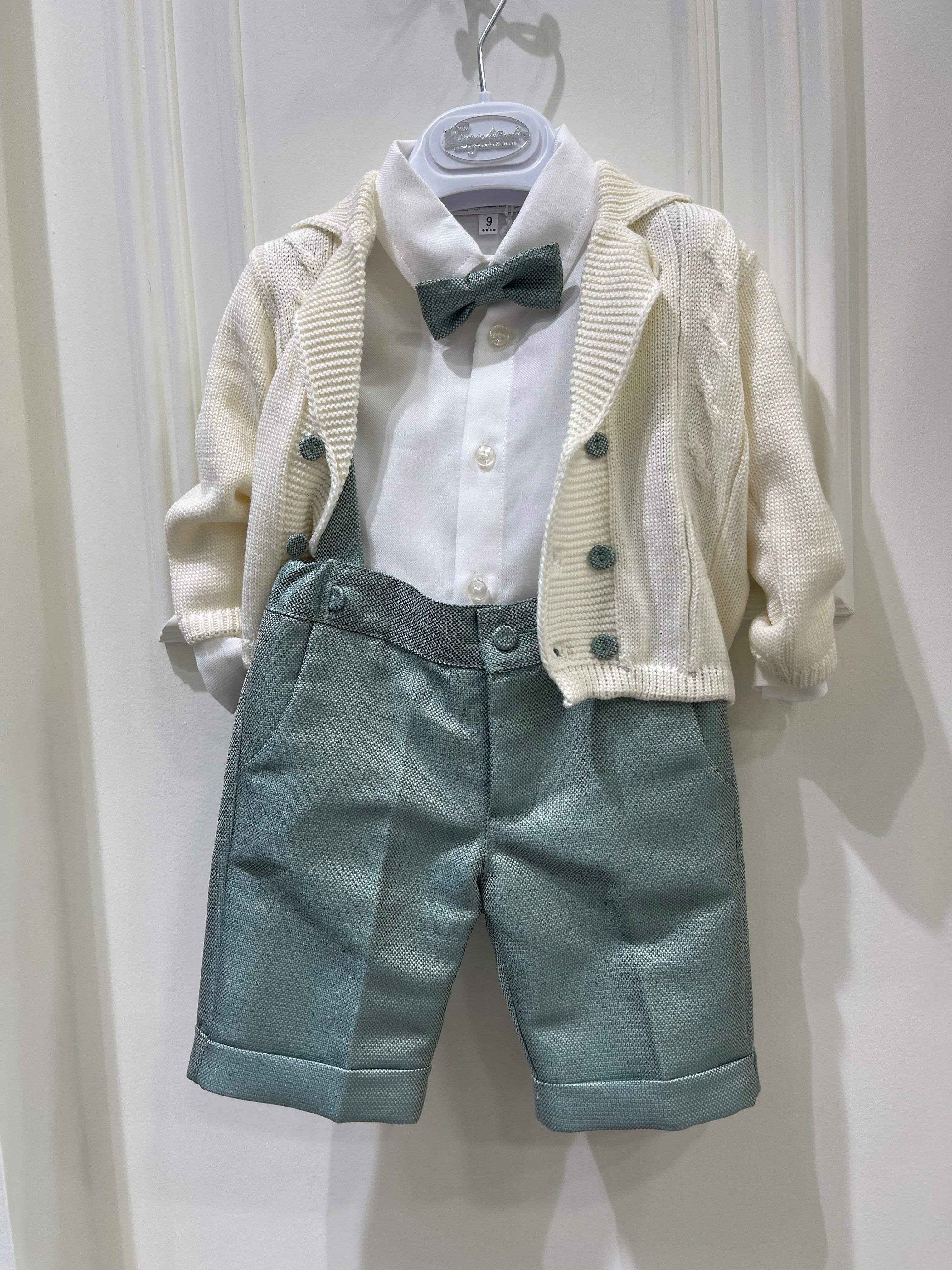Elegante completo pantalone in tessuto micro fantasia all inglese verde salvia con bretelle , camicia , papillon , e cardigan... Per saperne di più