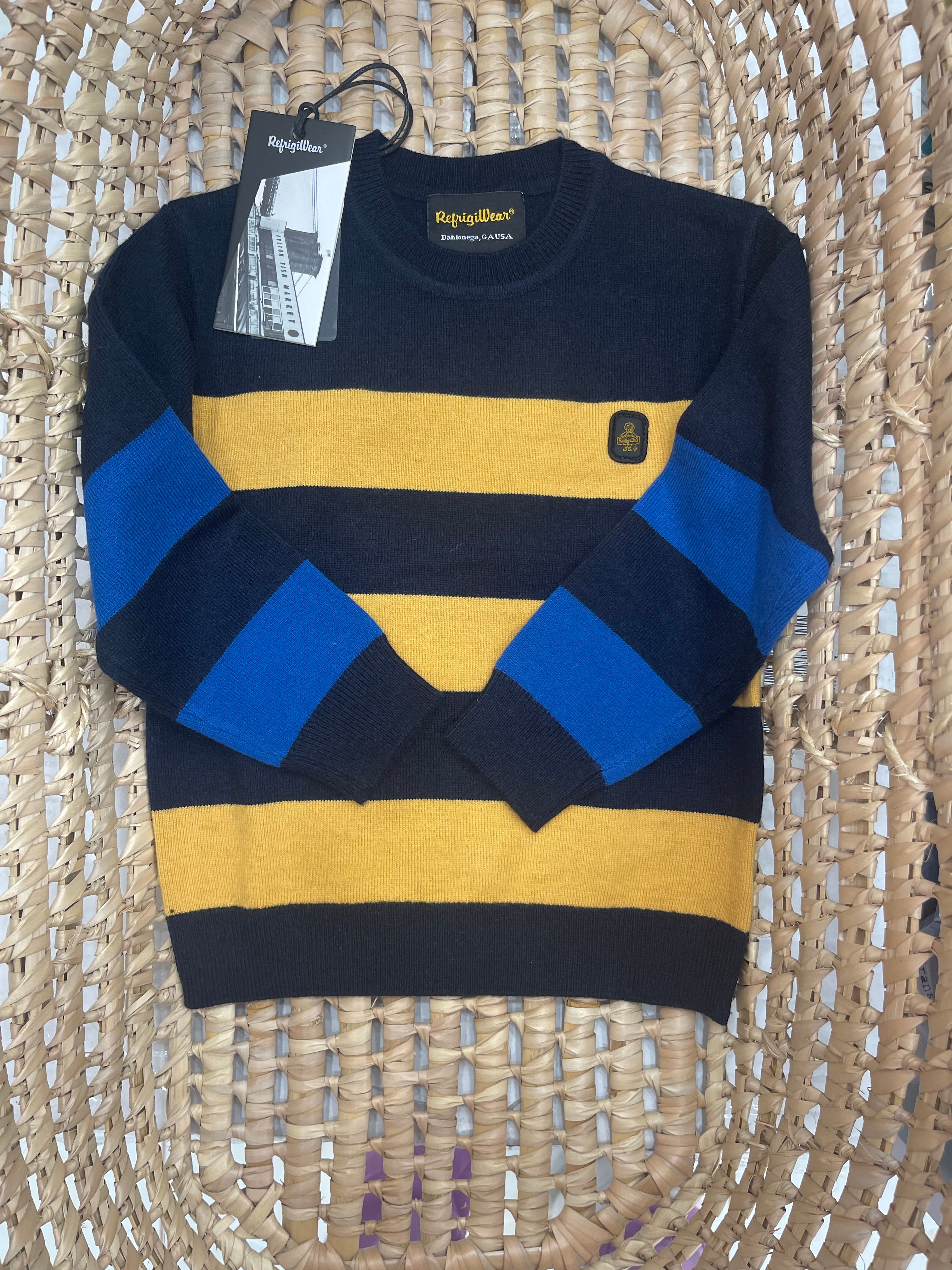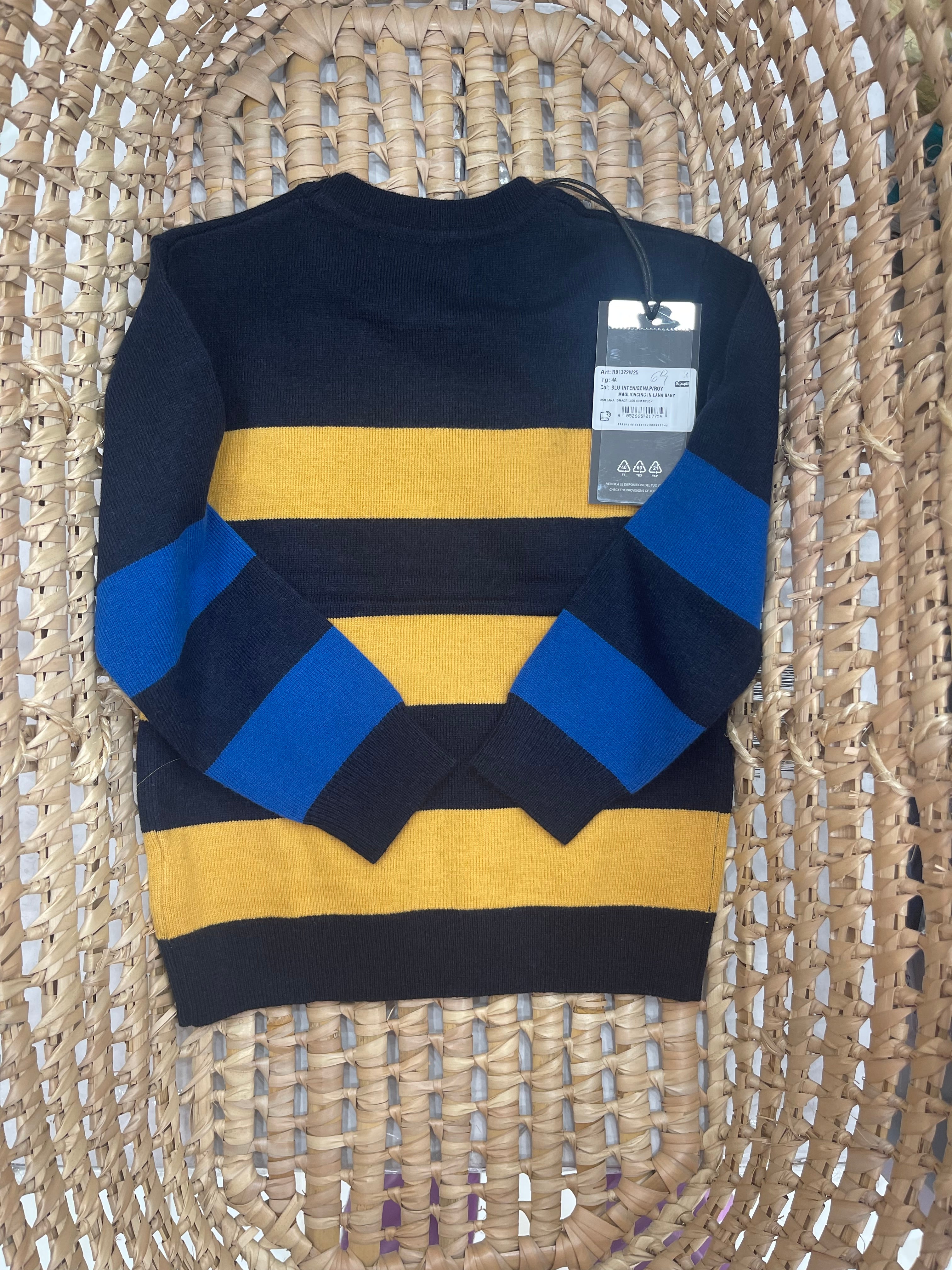 Maglioncino in misto lana , fondo blu con righe senape , polsini e giro collo vestibilità regolare Per saperne di più