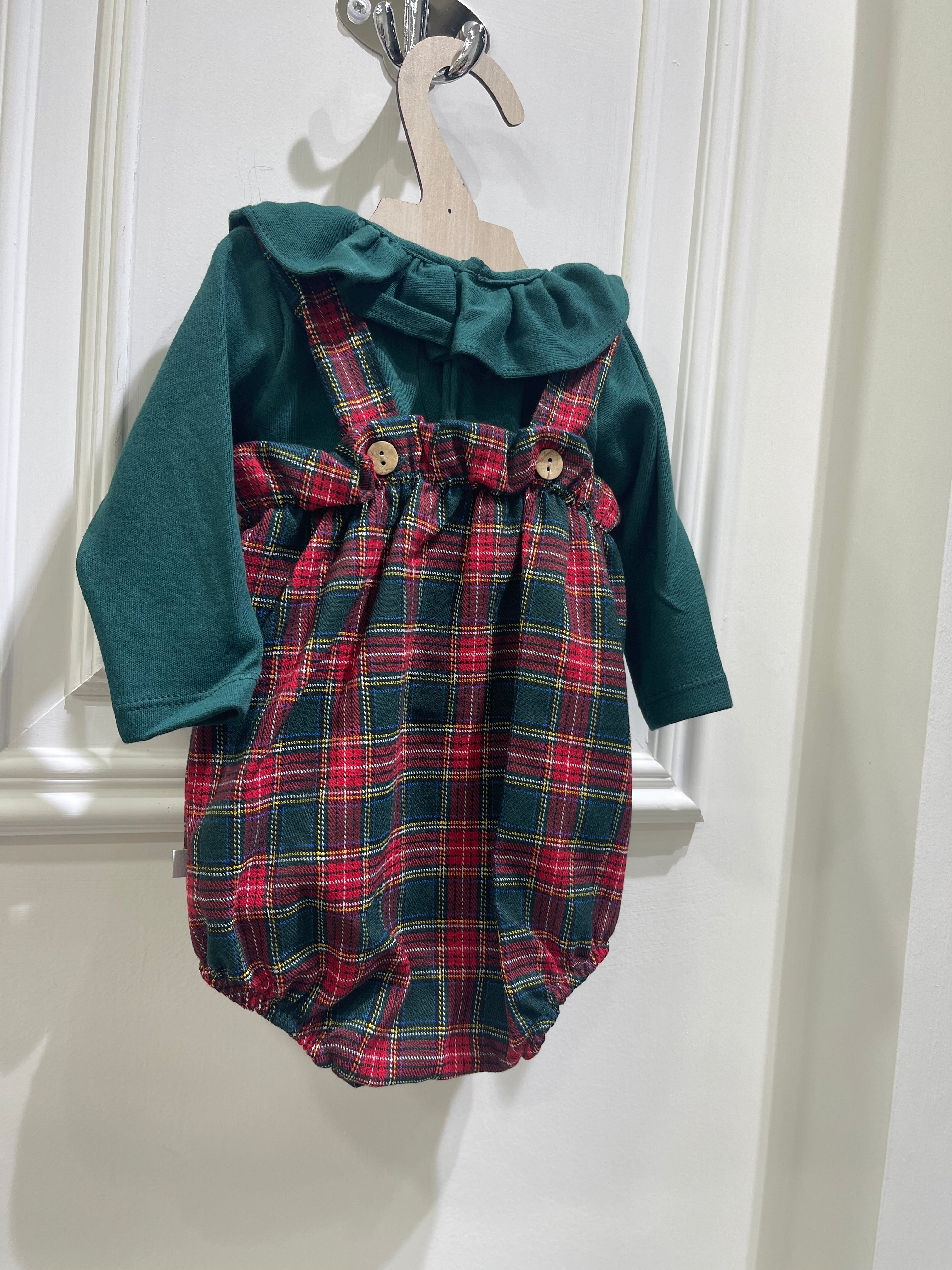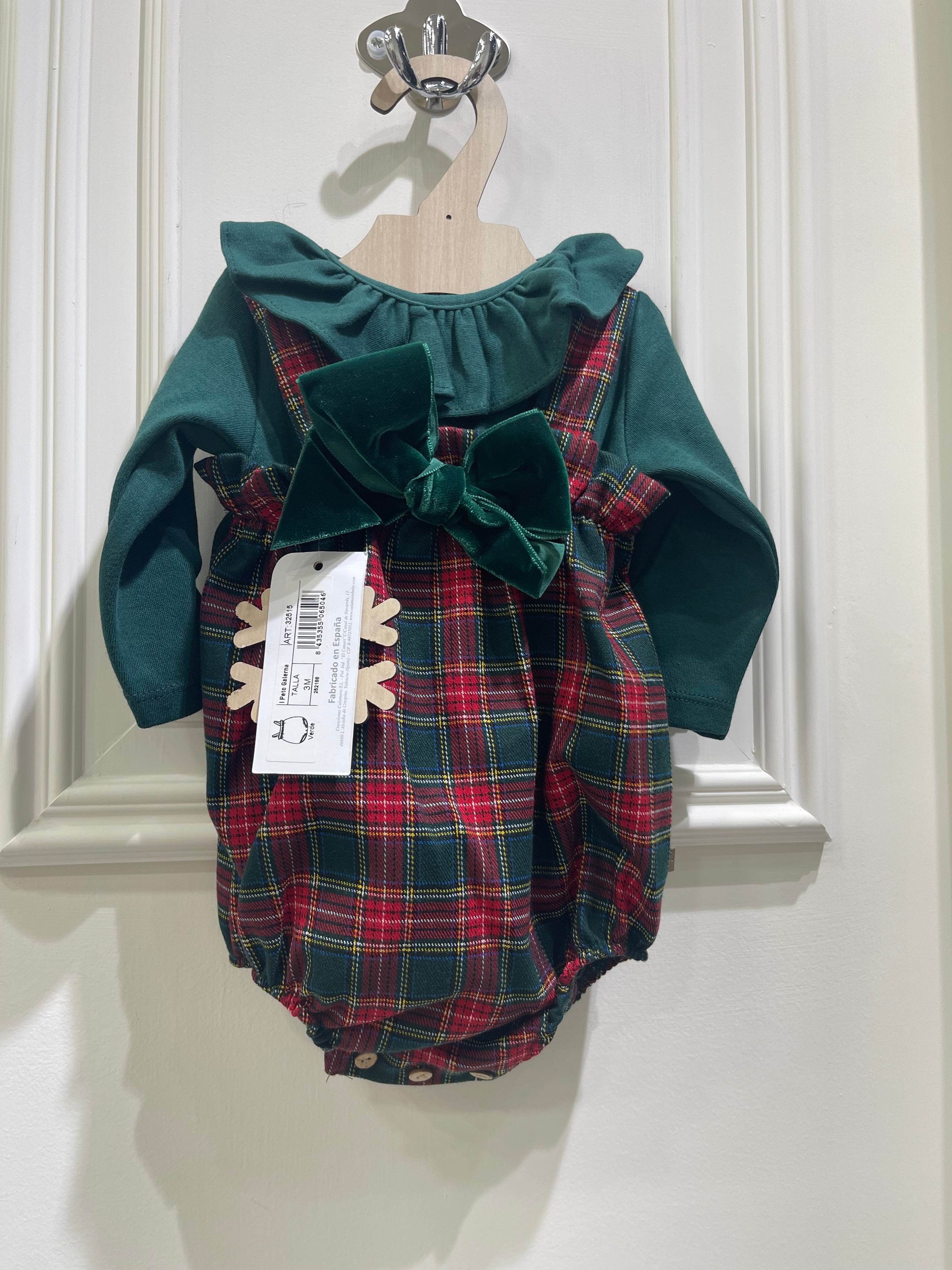 Salopette in tartan con fiocco di velluto verde con body con collo rotondo e rouche vestibilità regolare Per saperne di più