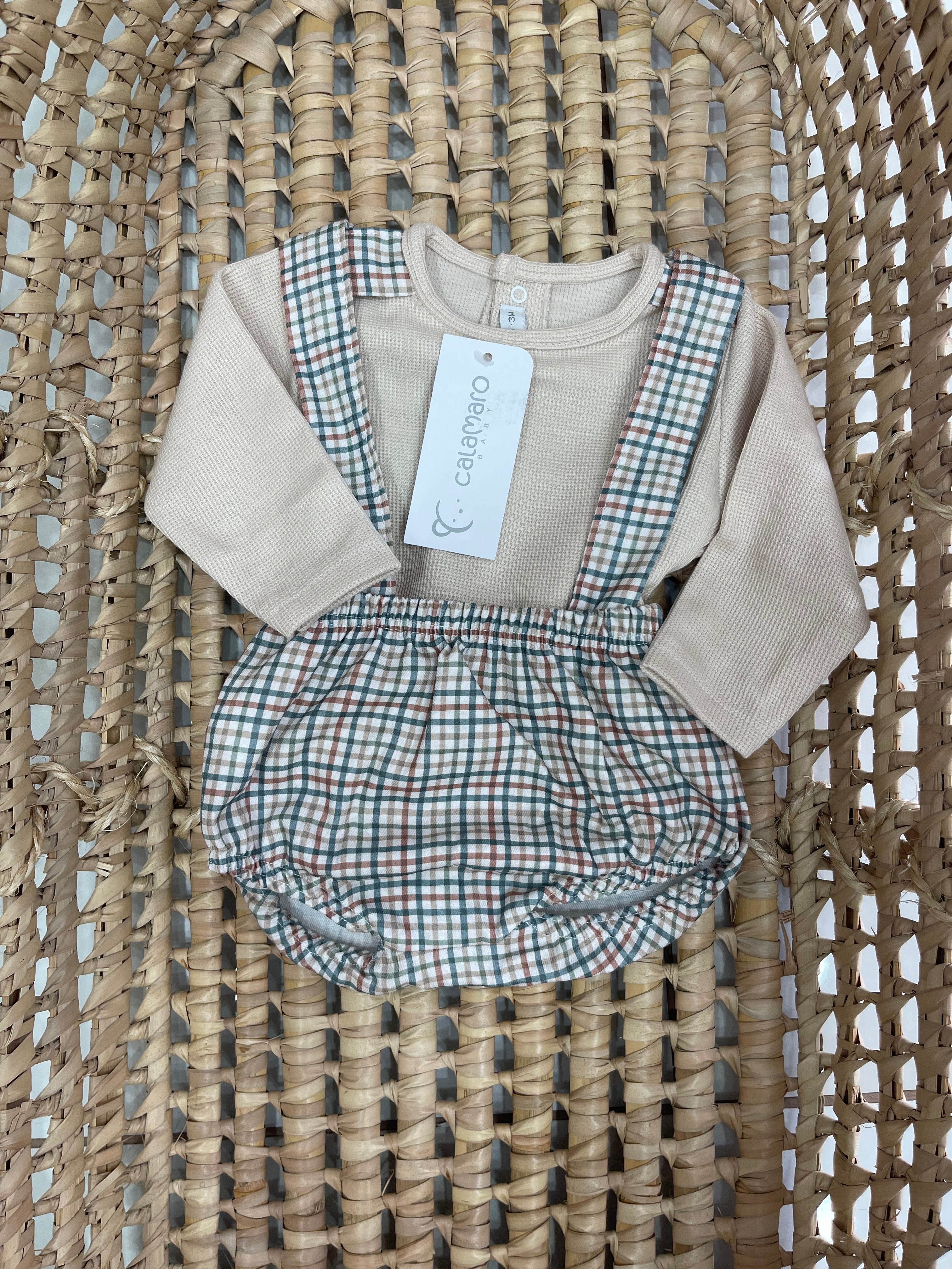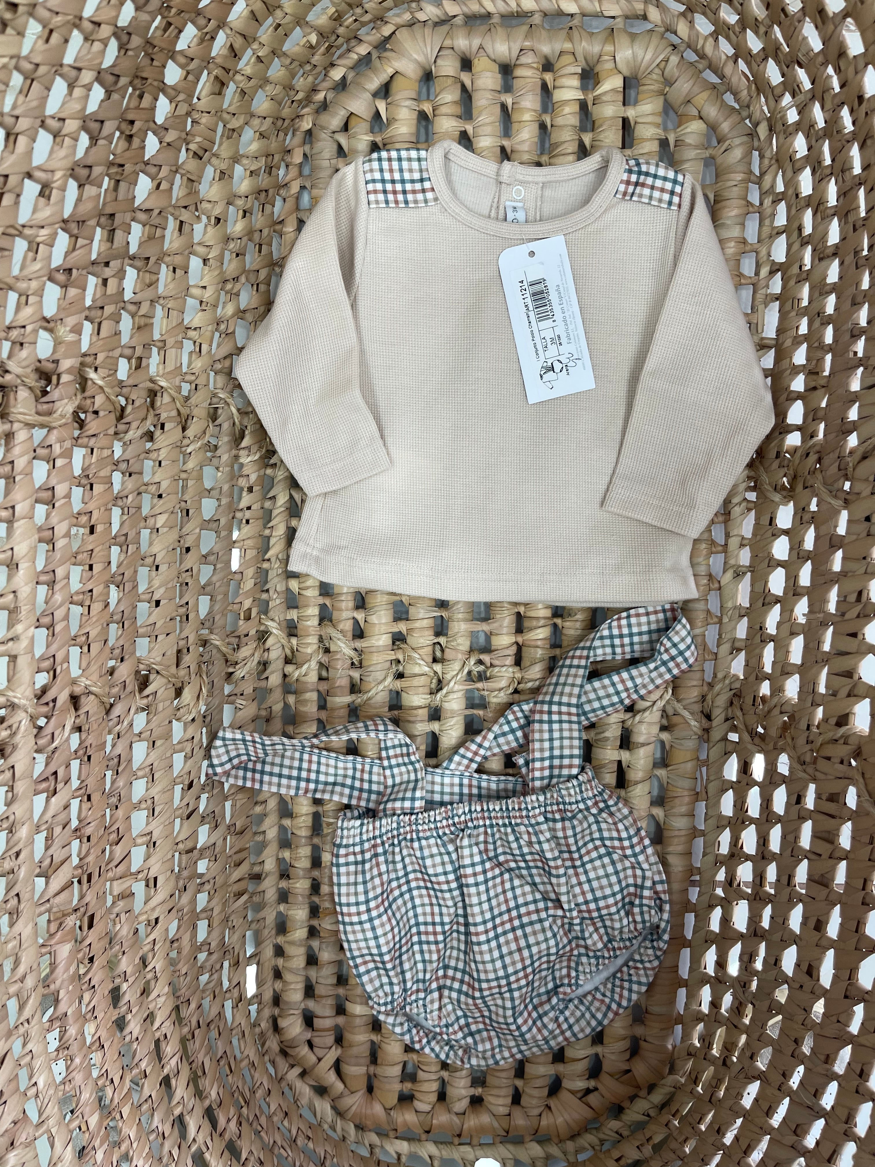 Completo bimbo composto da culotte a quadretti con bratelle e maglietta in caldo cotone coordinata con bottoncini sul retro vestibilità... Per saperne di più