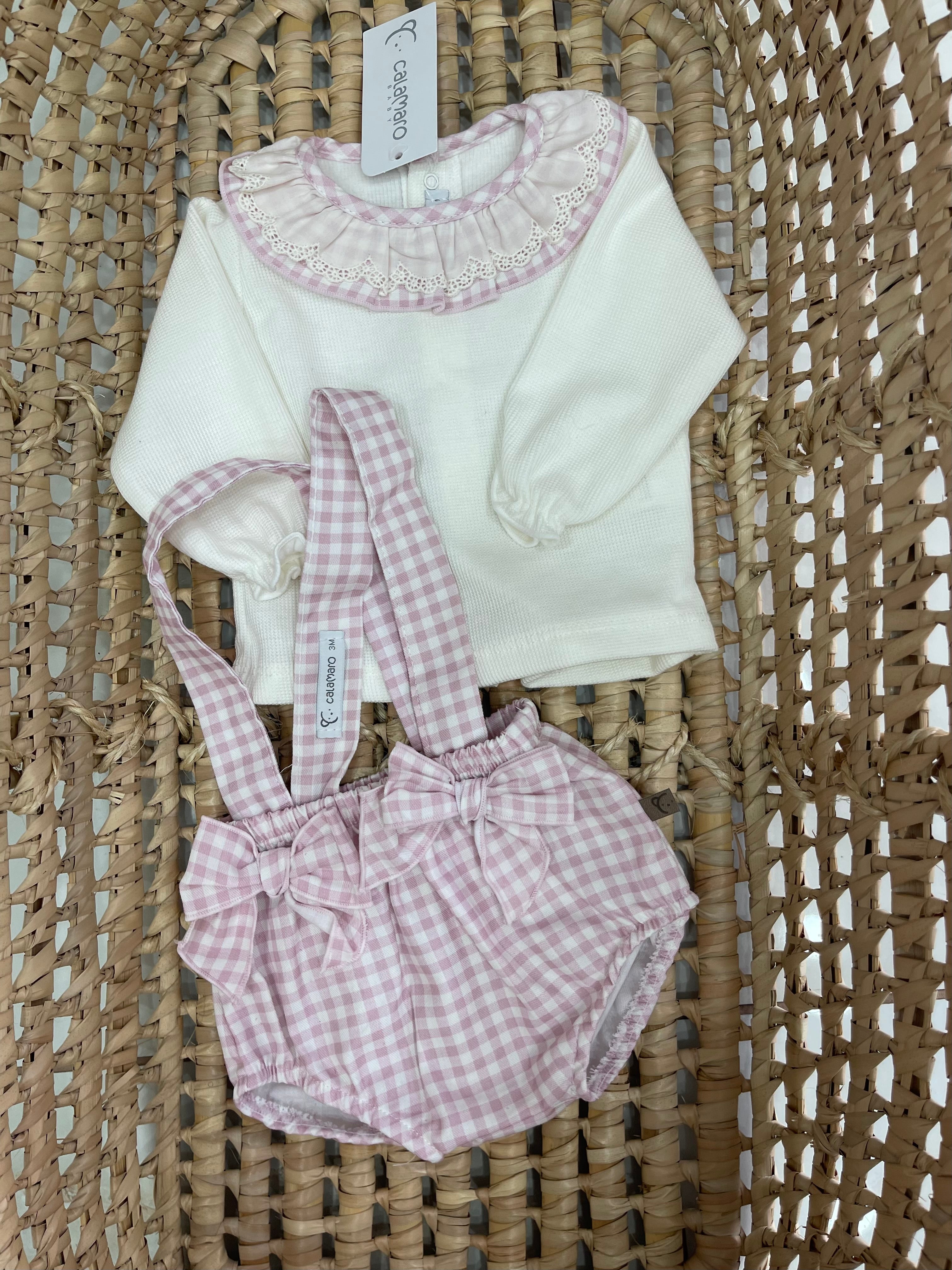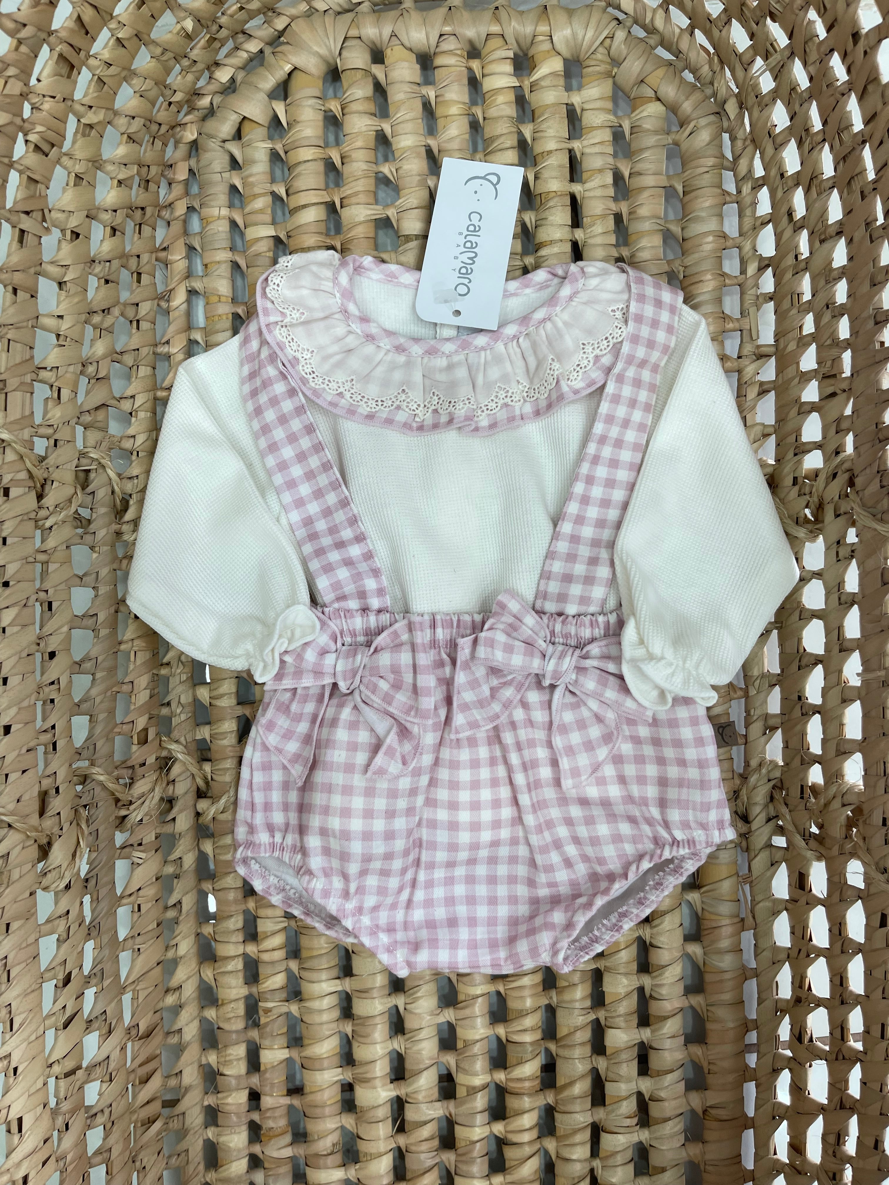 Salopette in tessuto vichy con fiocchetti , composta da Salopette a culotte con bratelle e maglietta con collo rotondo in... Per saperne di più