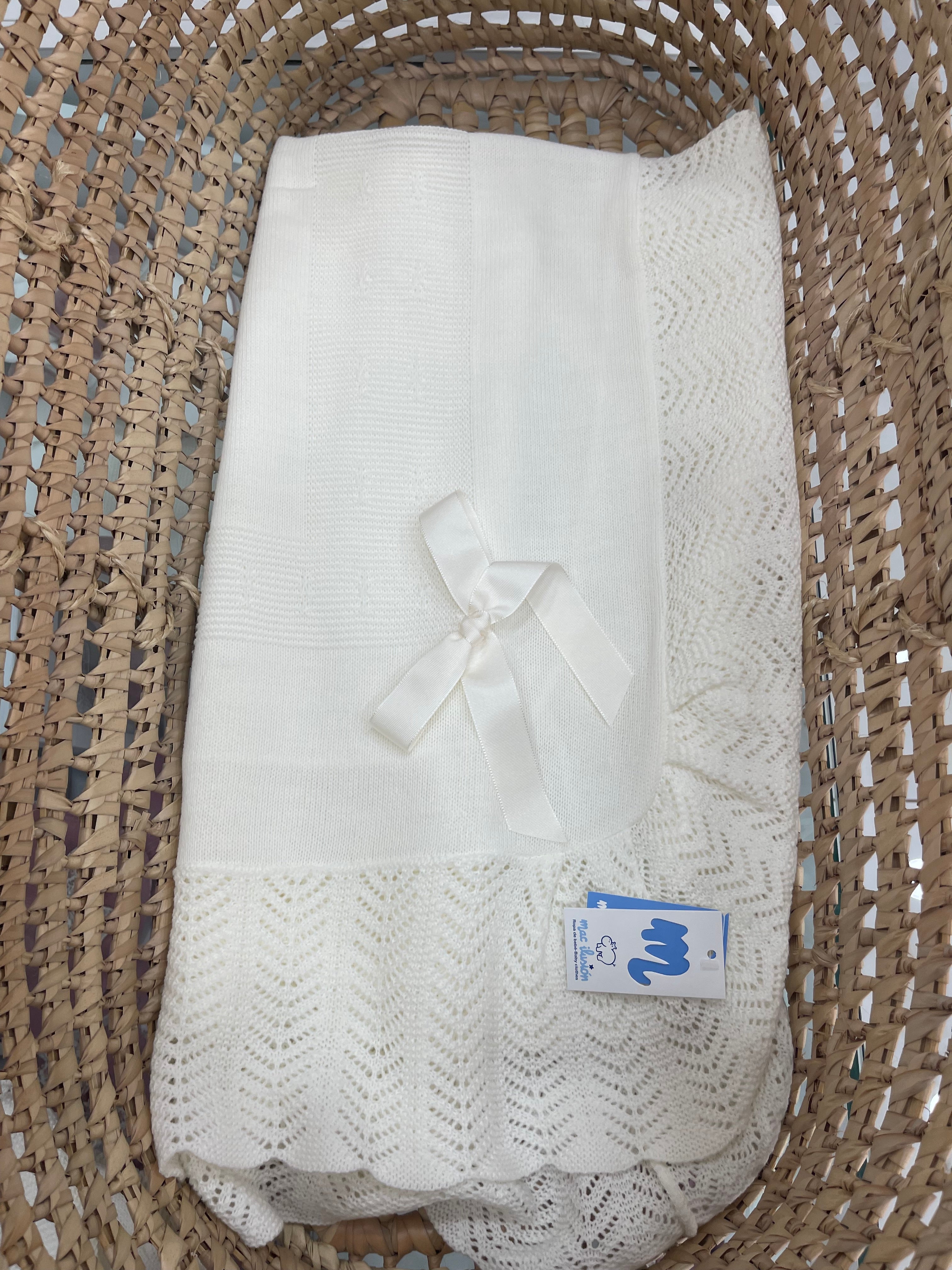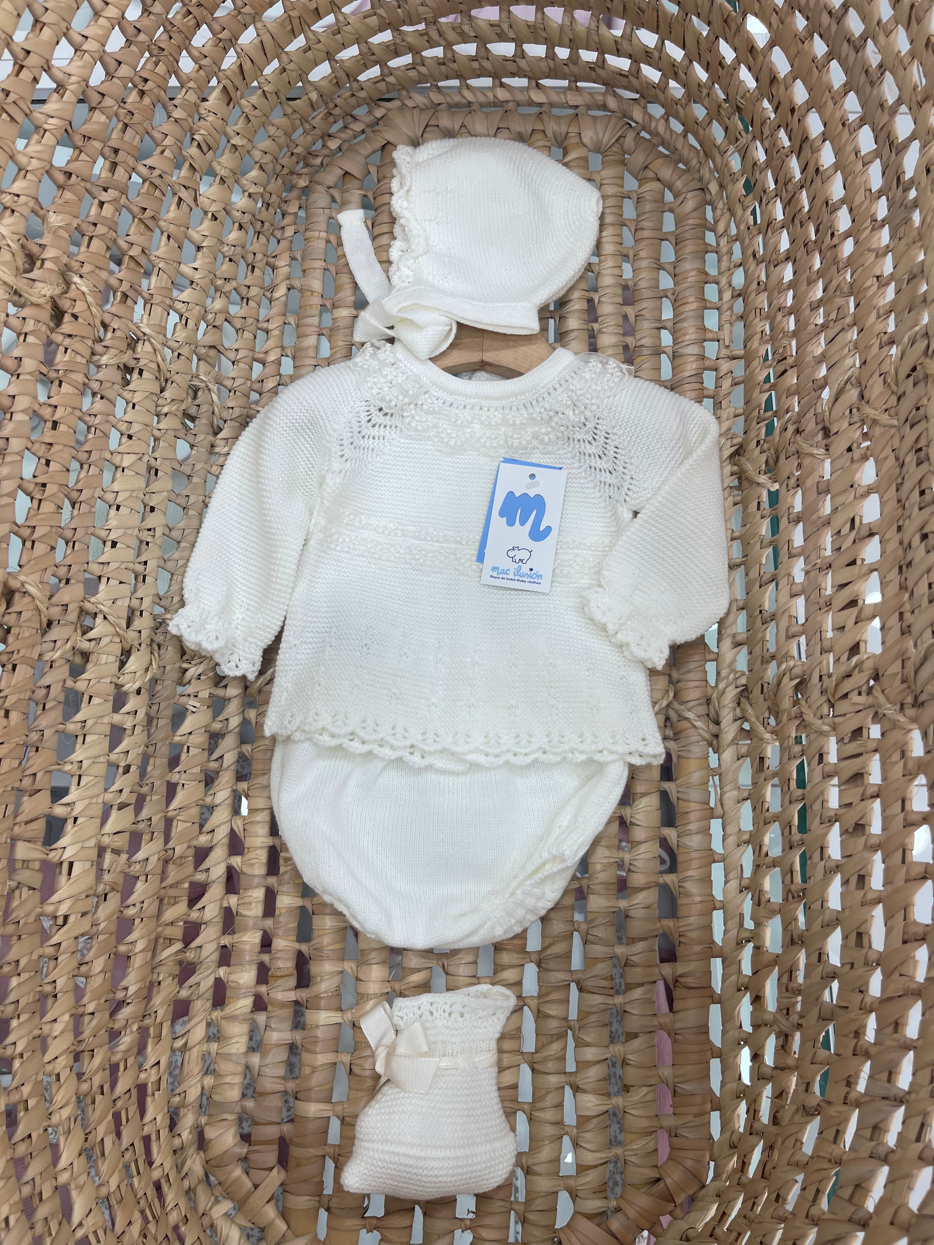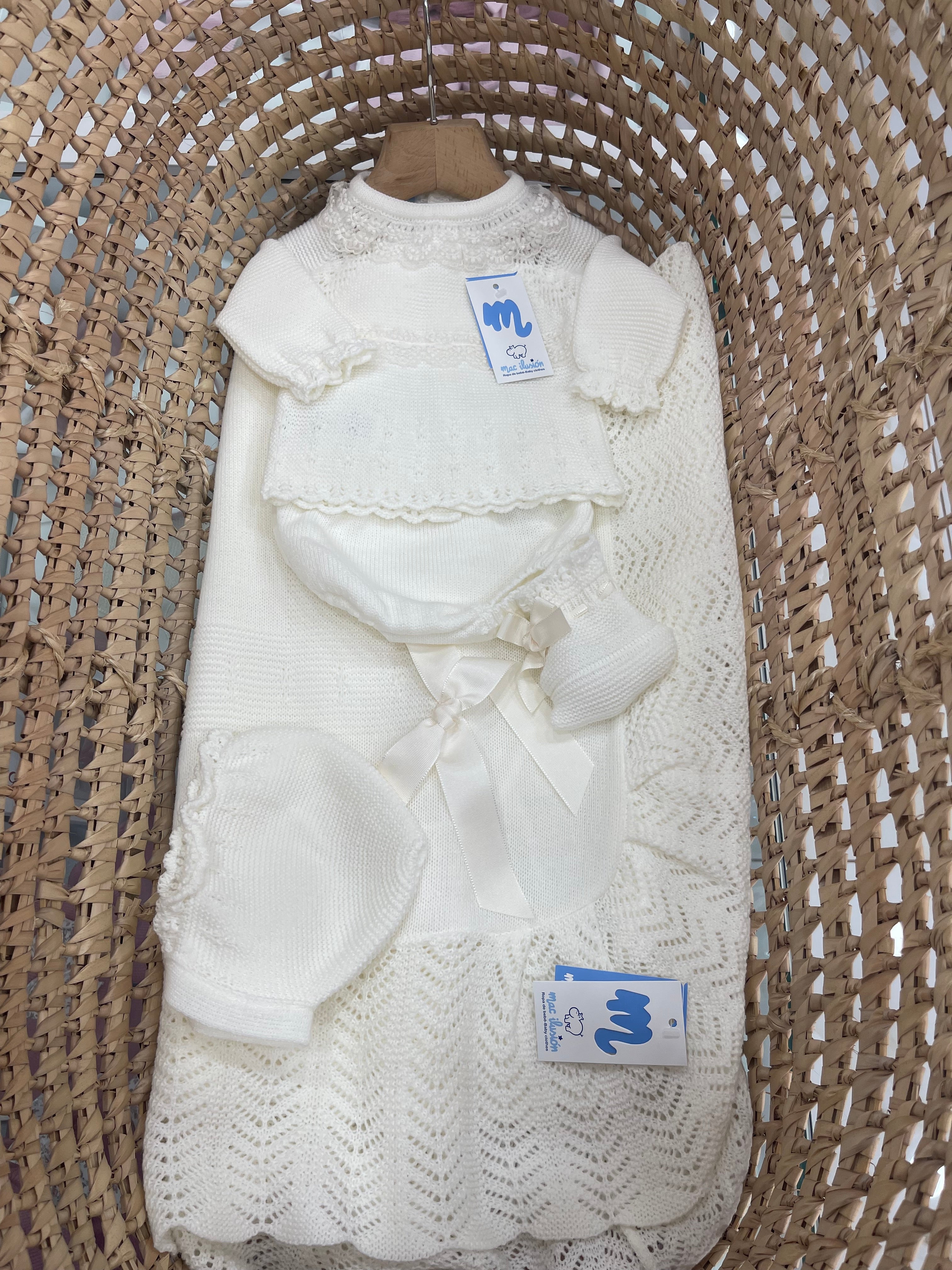Set coperta con fiocco e ricamata , Pagliacetto composto da maglietta e culotte con pizzo e cuffia e babbucce Per saperne di più