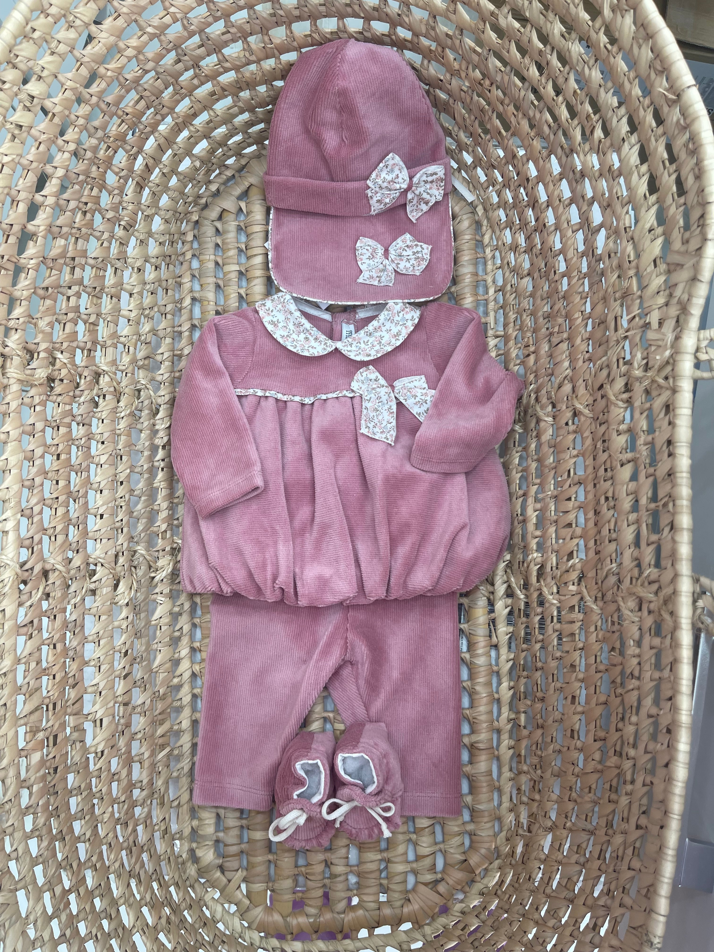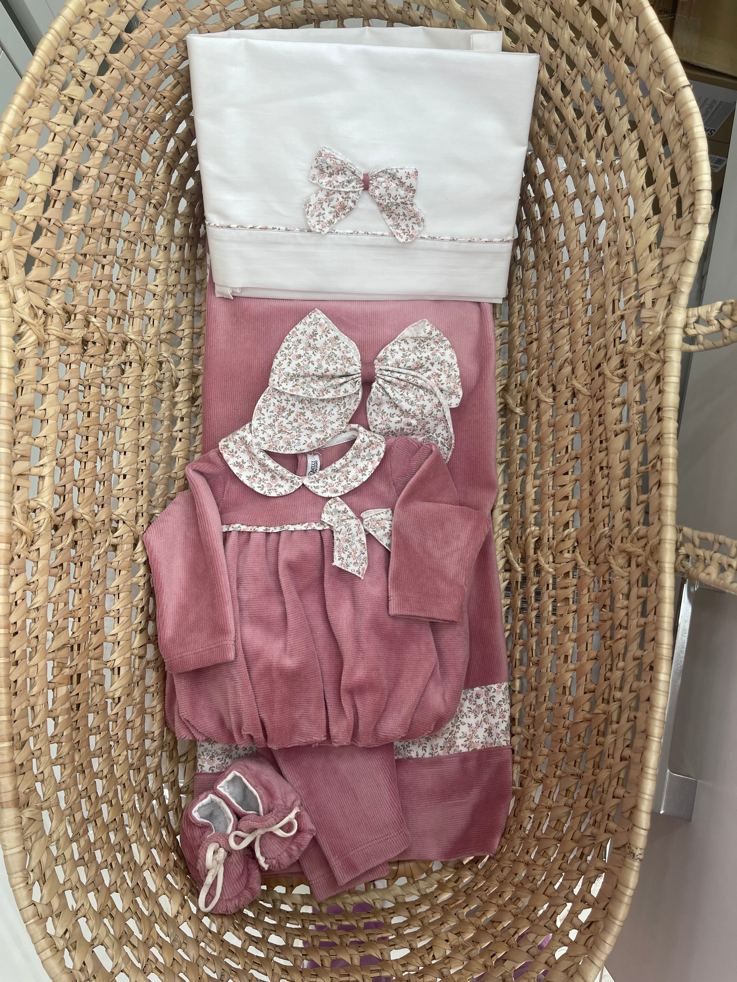 Set Nascita in velluto , coperta con fiocco ricamato, vestina con ghettina scarpine , cappello e bavetta , coppia di... Per saperne di più