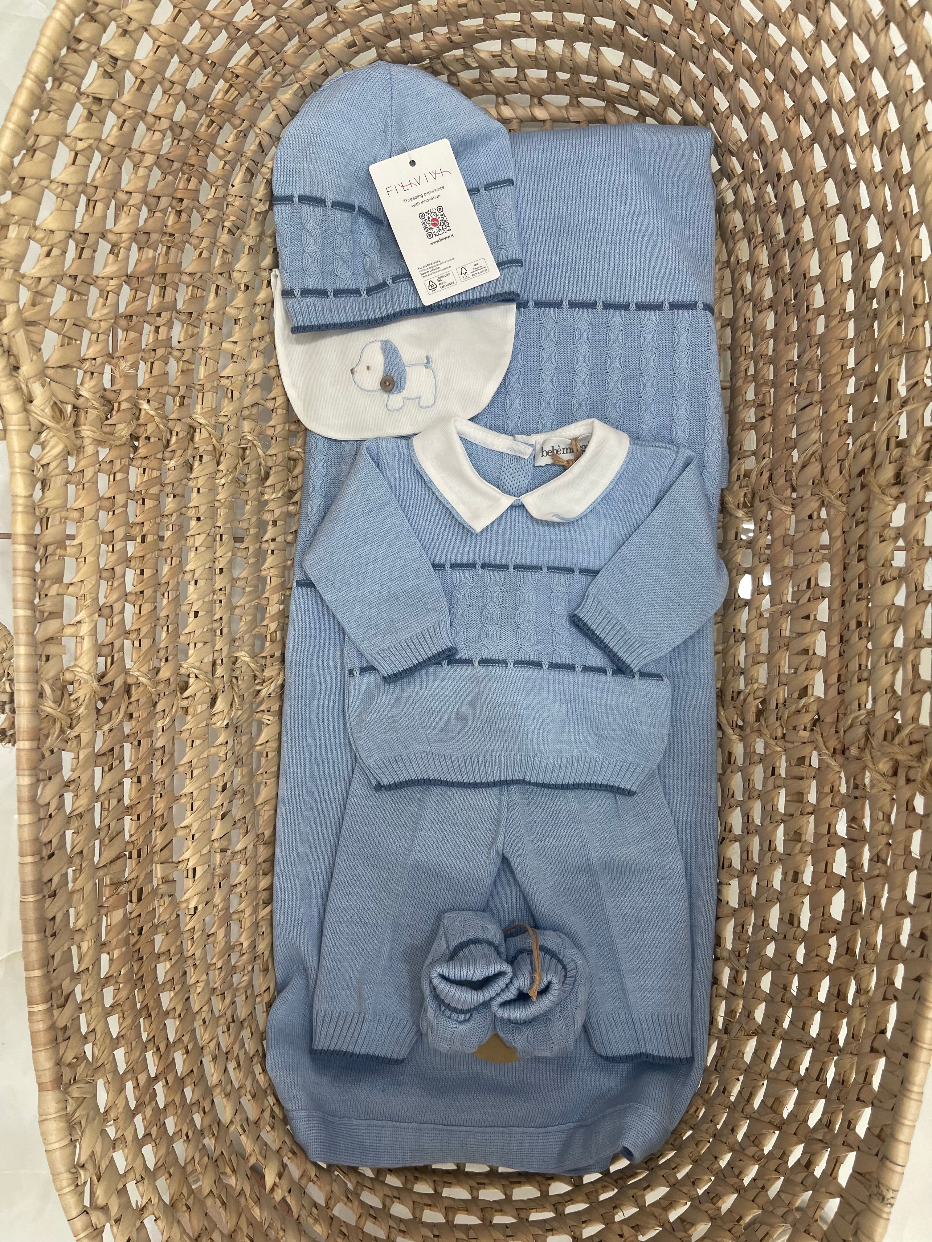 Set nascita in misto lana composto da coperta , spezzato con bottoni sul retro scarpette capelli e bavetta lavorata Per saperne di più