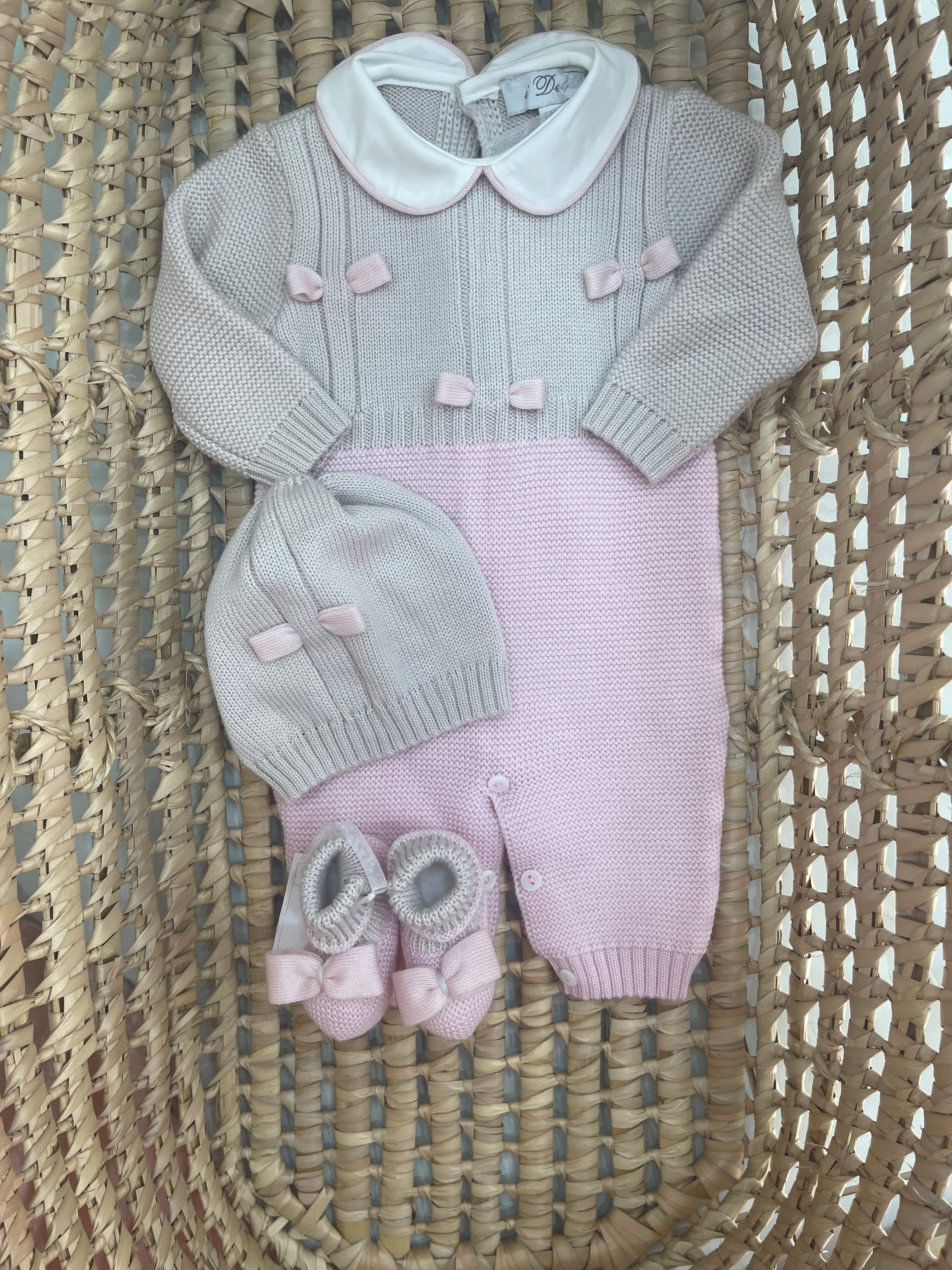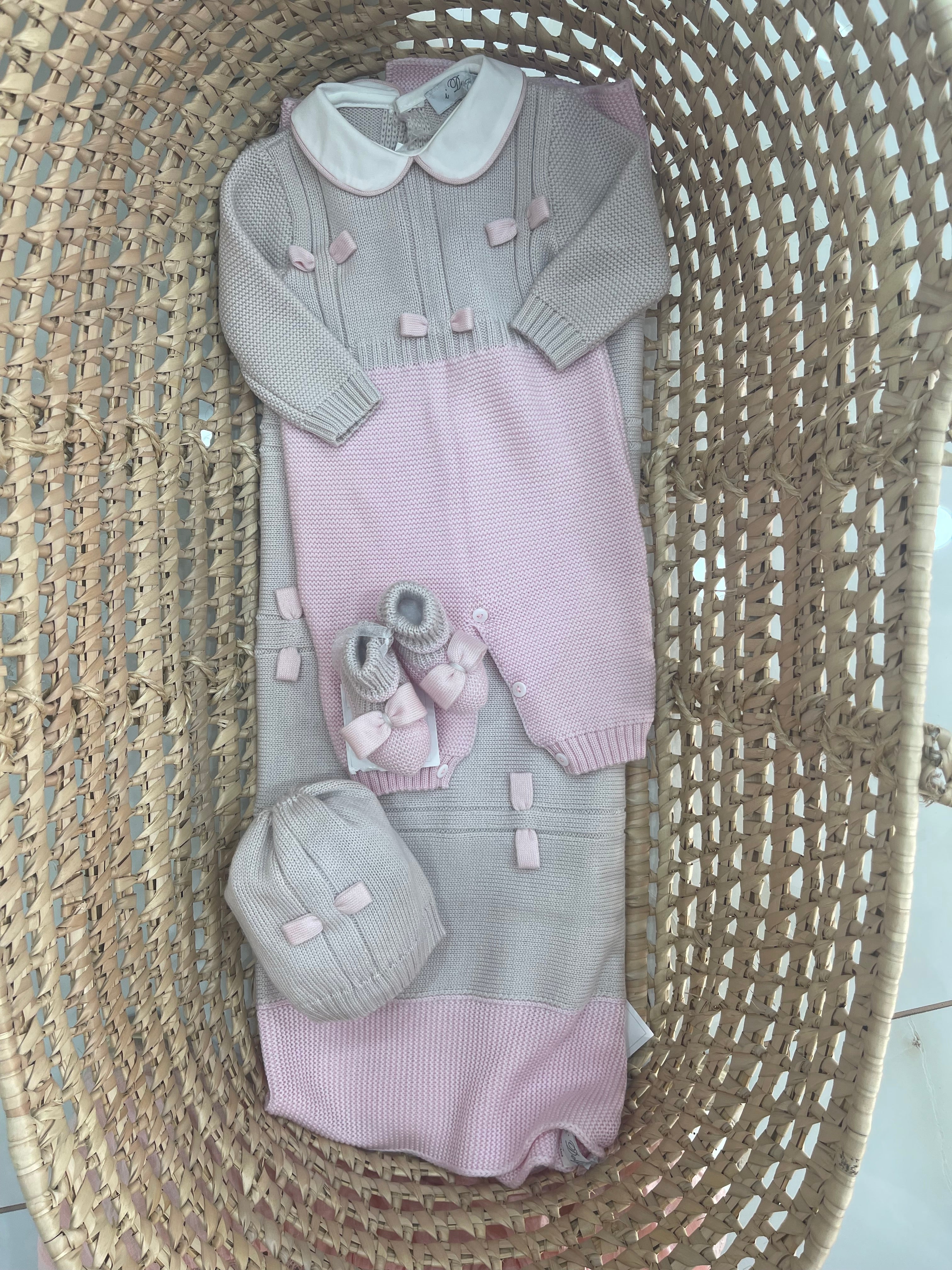 Uscita clinica per lei in pura lana , coperta doppio colore con fiocchi cuciti in contrasto , tutina , babbucce... Per saperne di più
