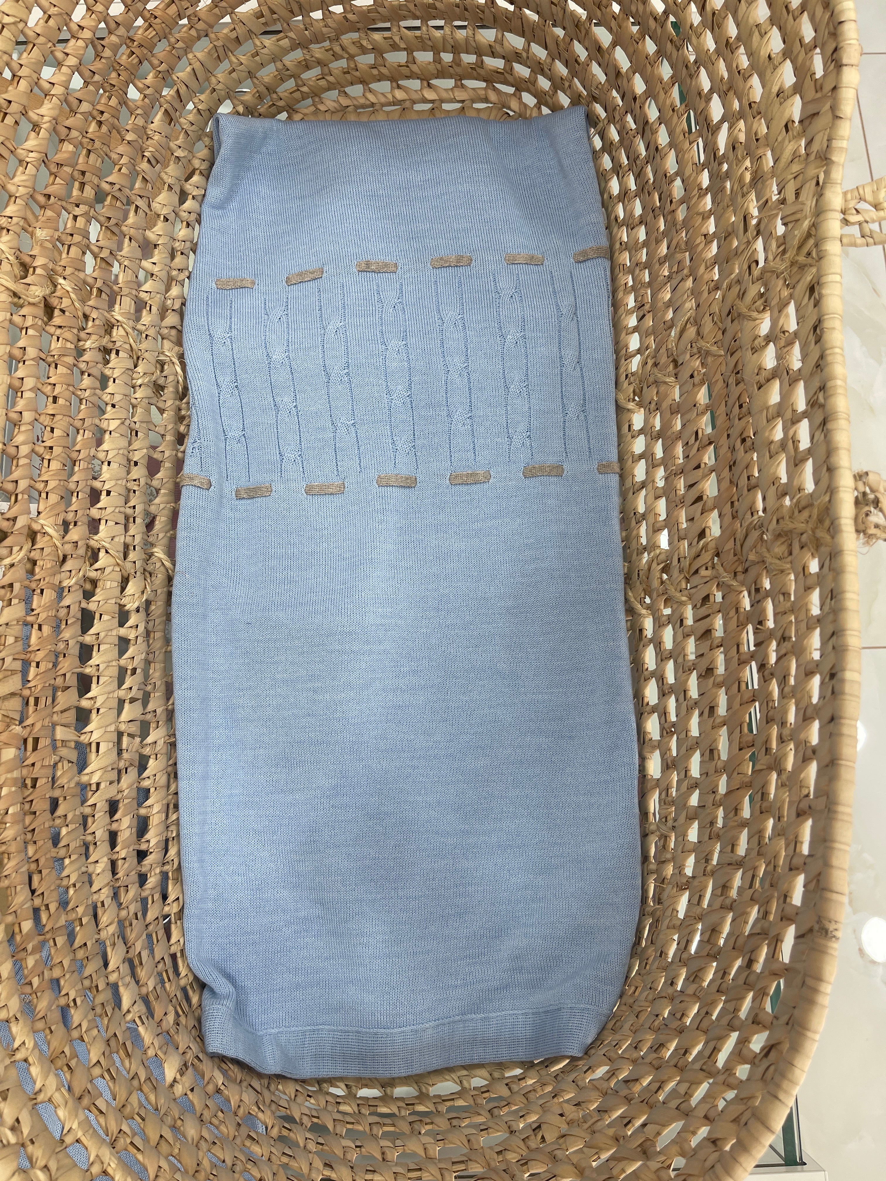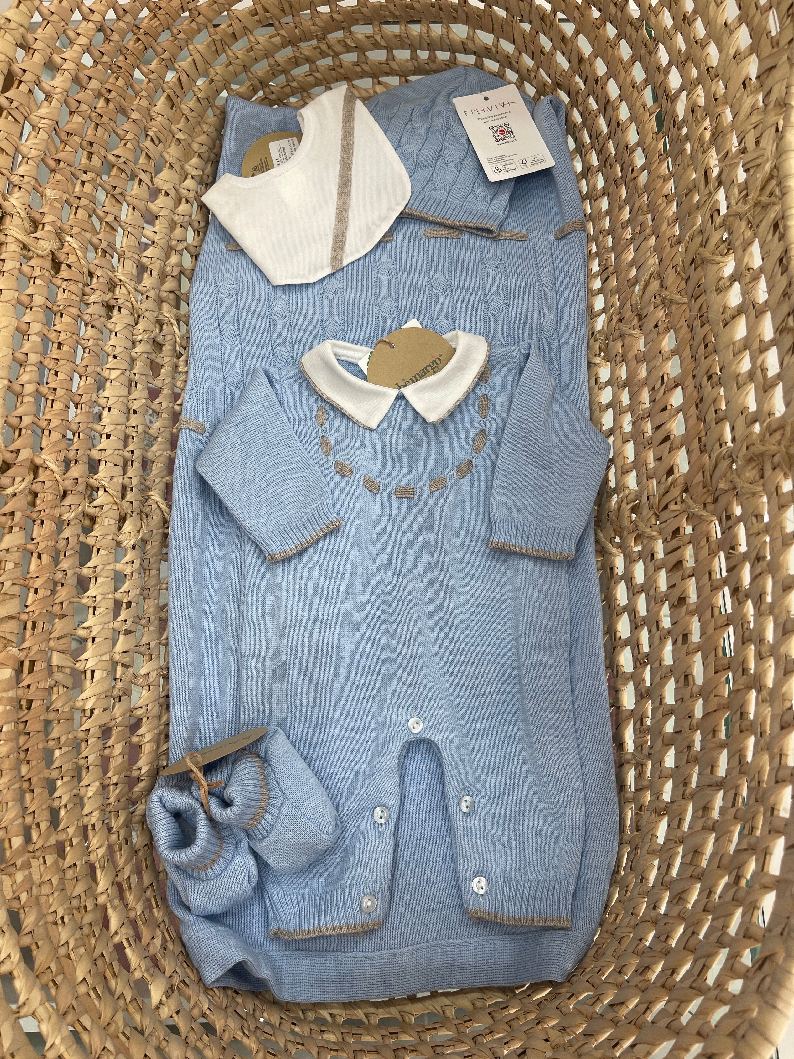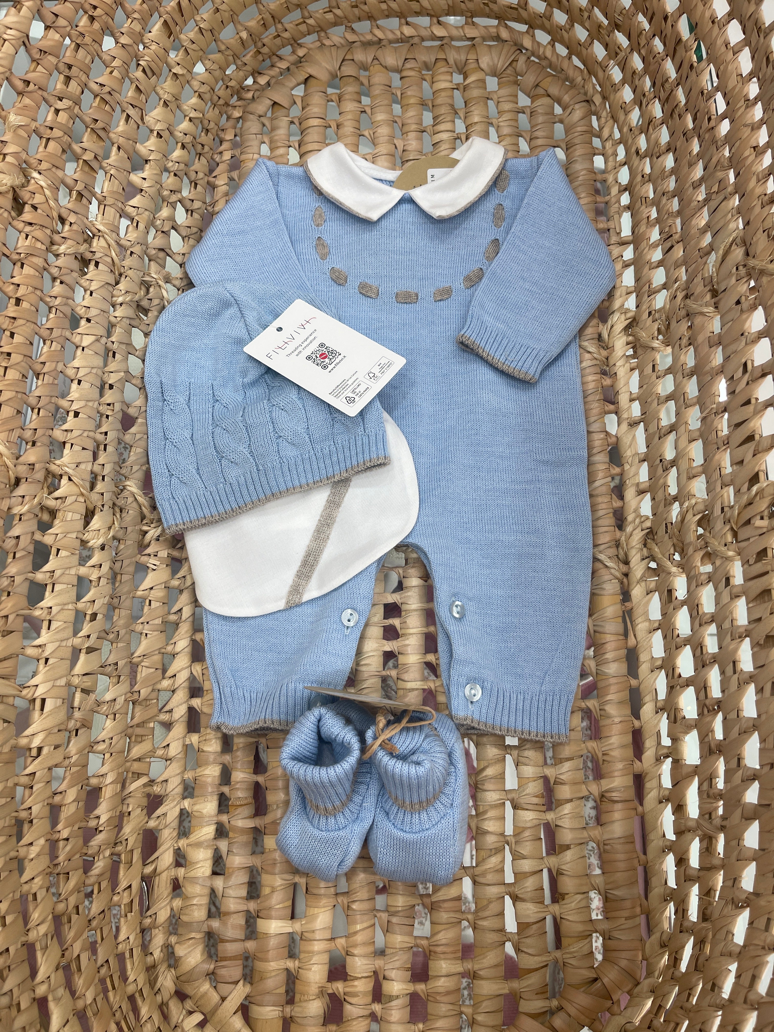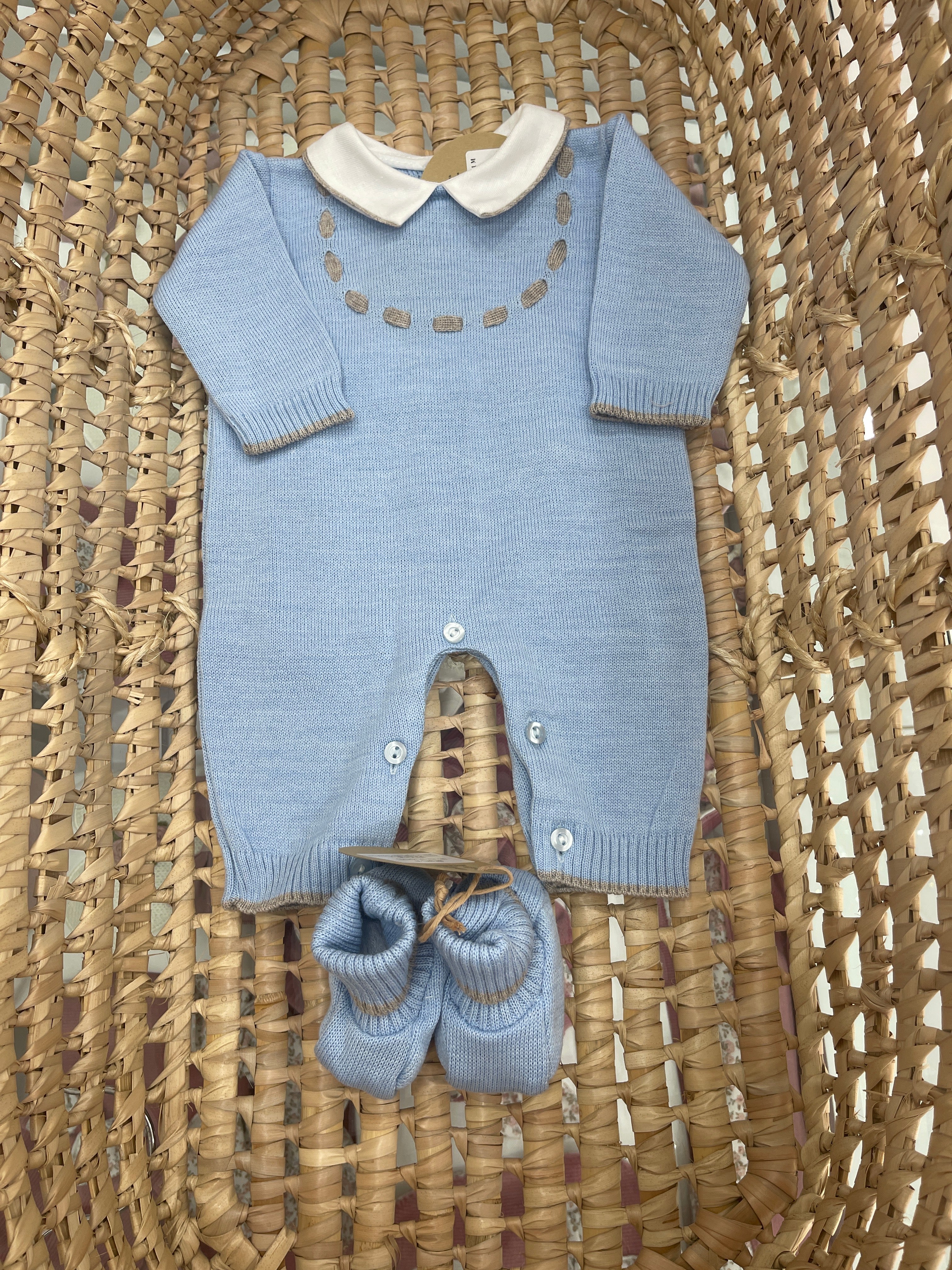 Coordinato misto lana in cielo e beige con colletto in contrasto senza piedini con bottoncini sul retro e sotto ..... Per saperne di più