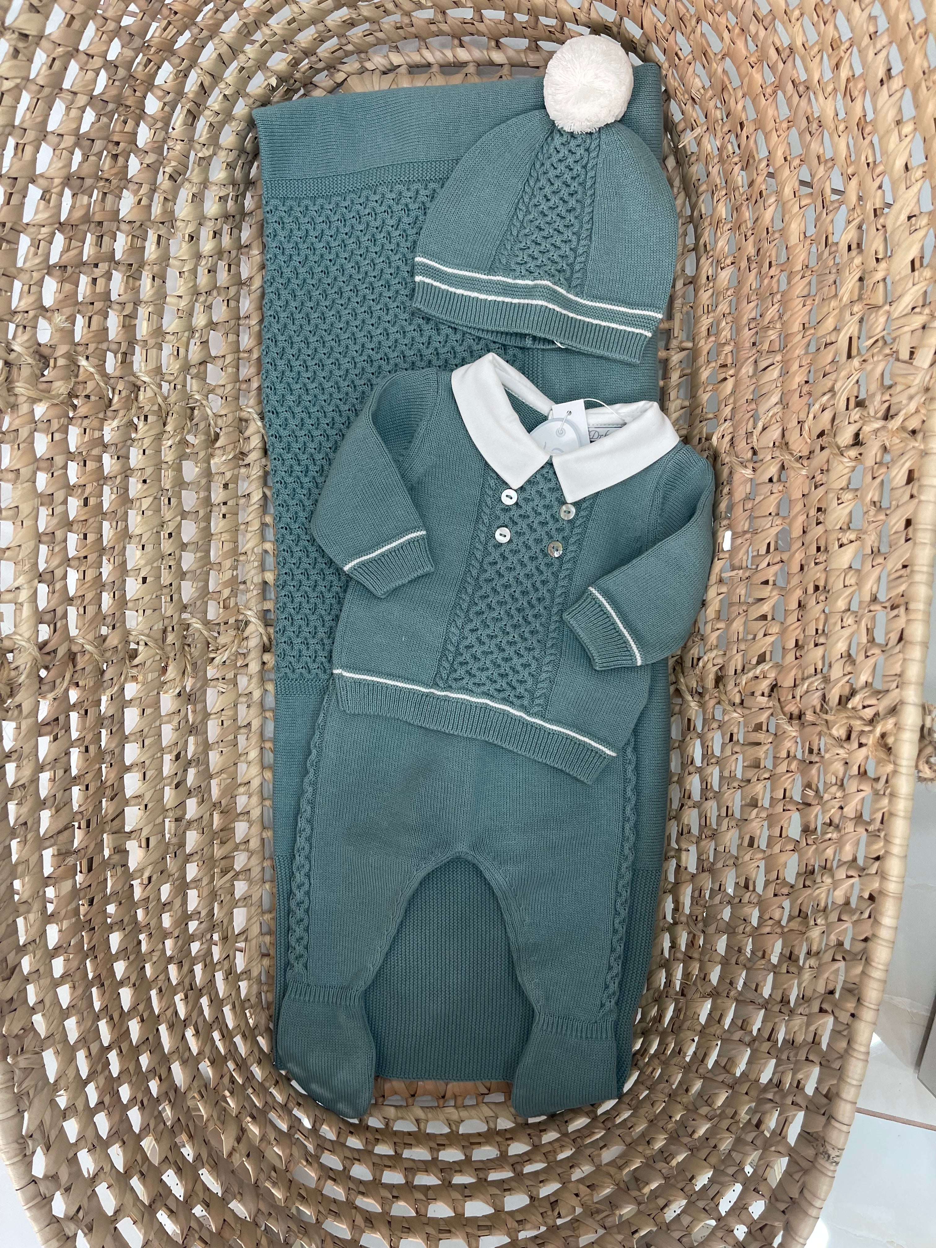 Set Nascita verde salvia , coperta lavorata a trecce , Completo due pezzi , ghettina con piedino e cappello coordinato Per saperne di più