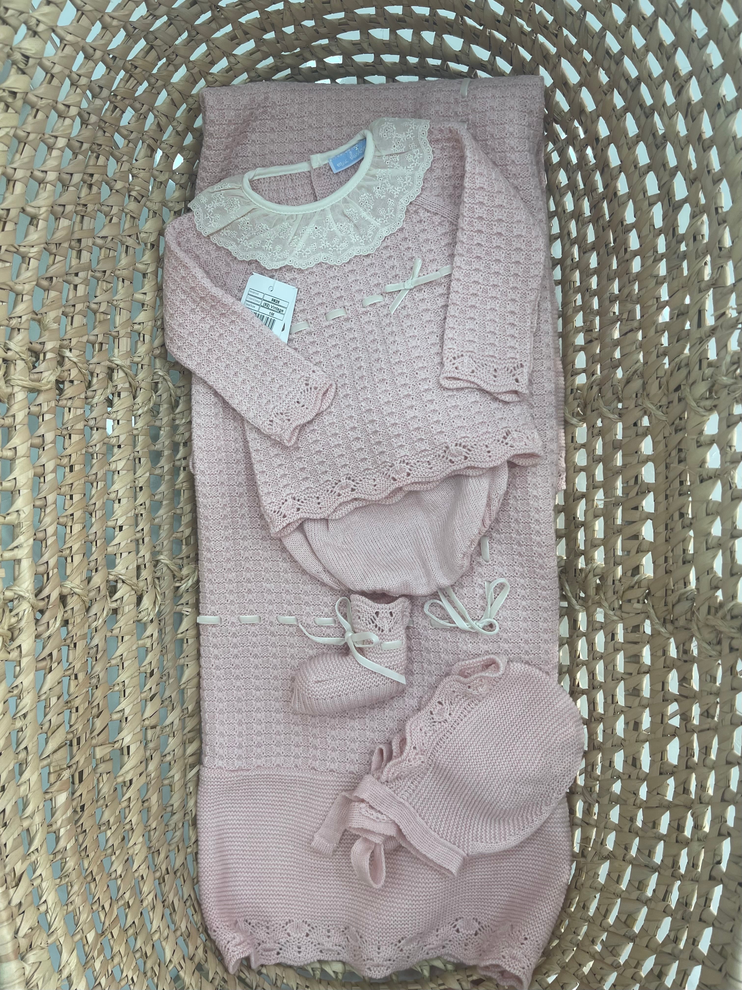Coordinato Nascita in rosa antico con dettagli panna in contrasto , completo di coordinato con culotte scarpine e cappellino Per saperne di più