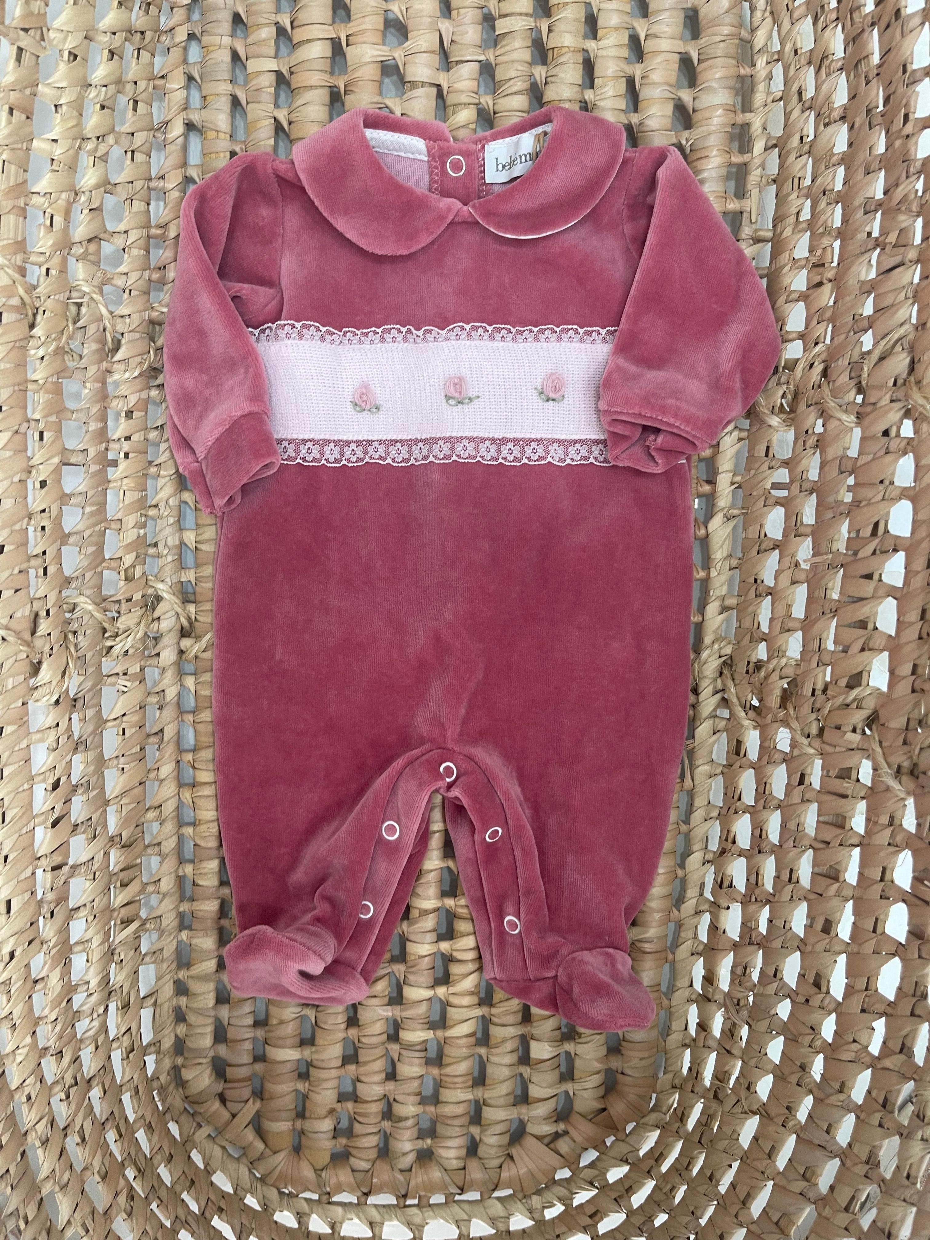 Tutina in ciniglia morbida con bottoni sotto e retro comoda ma restando chic con roselline ricamate in contrasto Per saperne di più