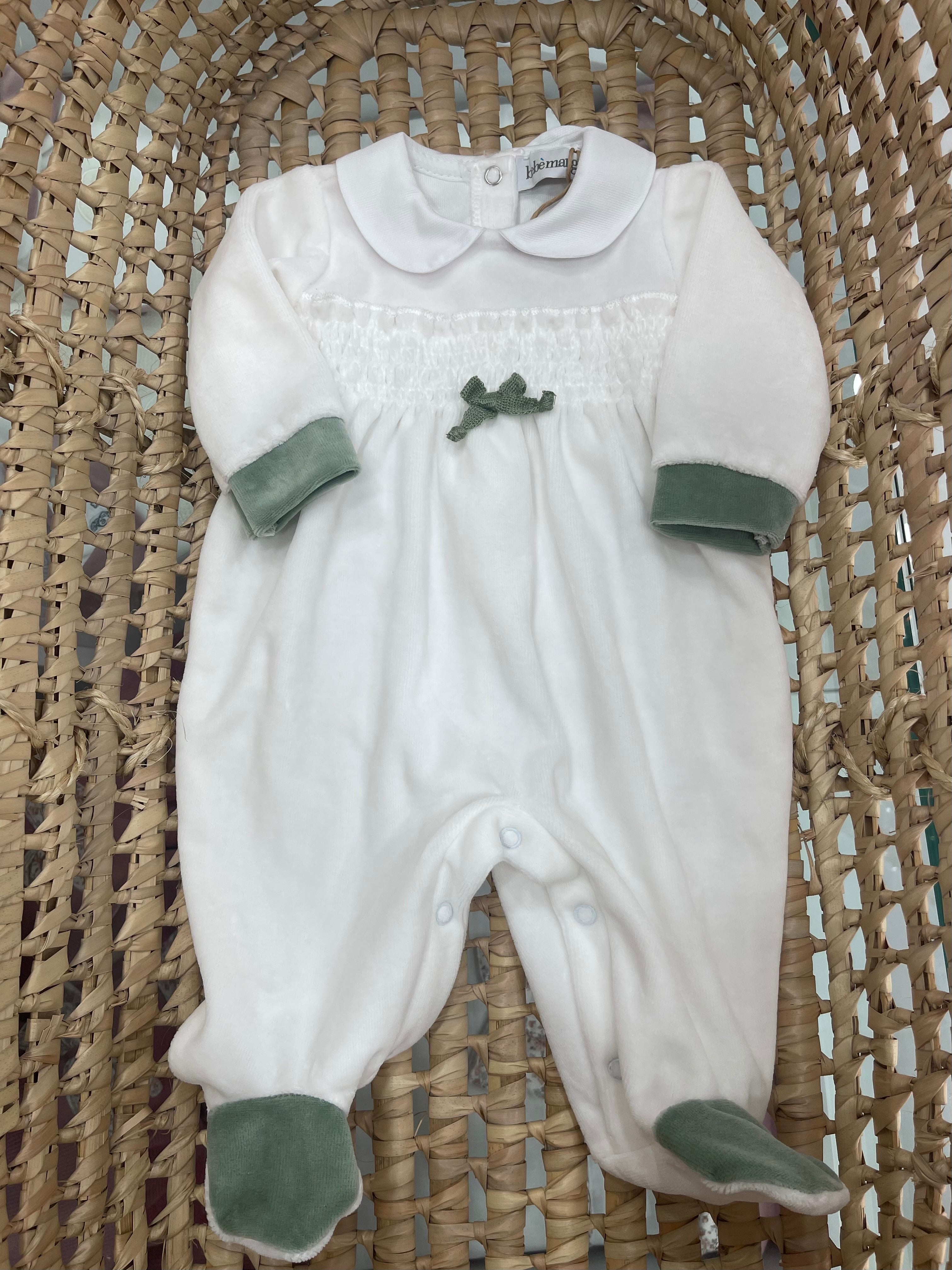 Comoda tutina in morbida ciniglia , con polsino verde e fiocco verde in tessuto , con piedini e bottoncini sotto... Per saperne di più
