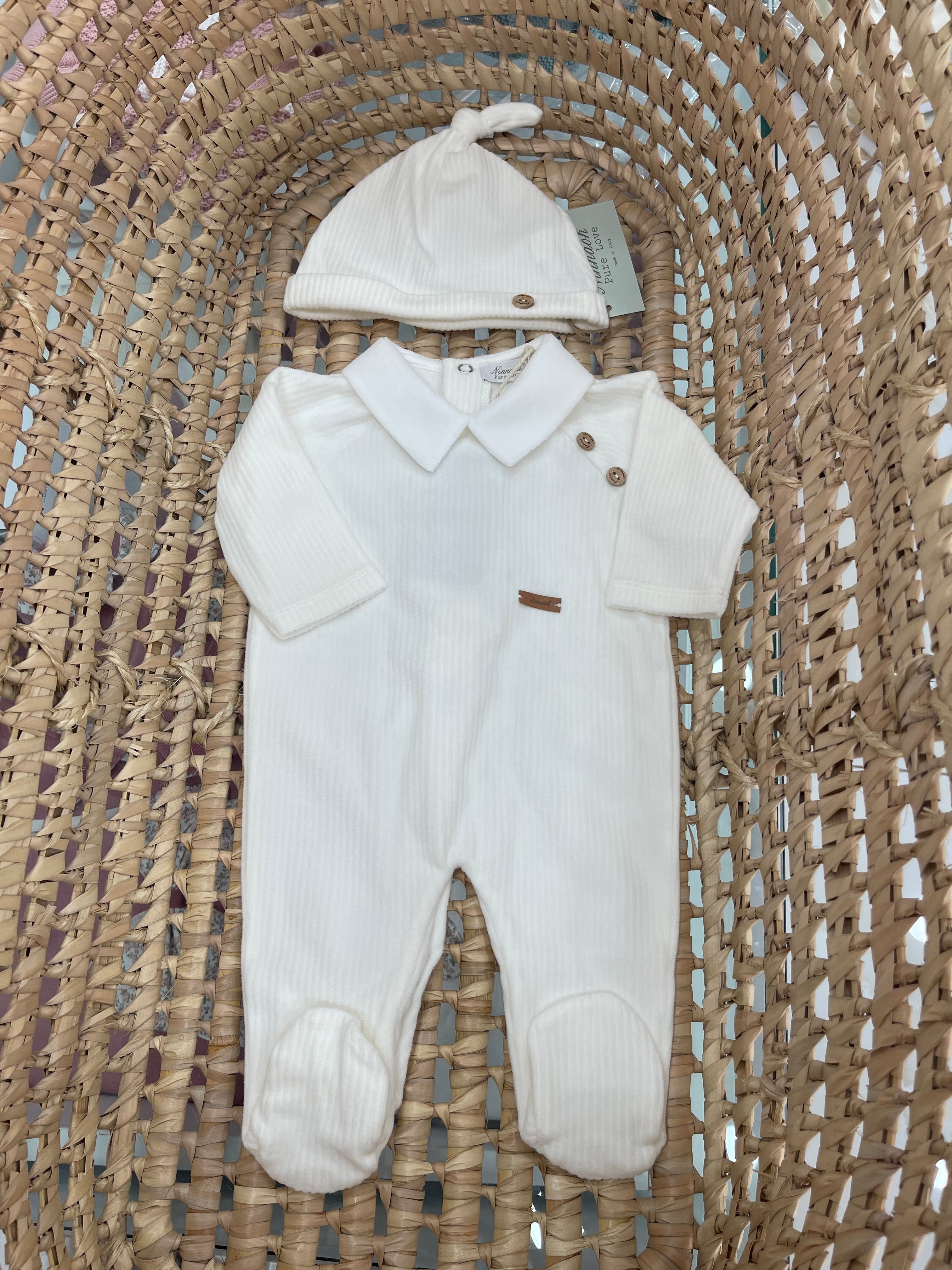 Tutina in ciniglia morbidissima a righe cannettate, con colletto in tessuto e cappello abbinabile Per saperne di più